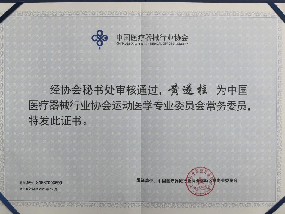 黄遂柱主任医师当选为中国医疗器械行业协会运动医学专业委员会常务委员