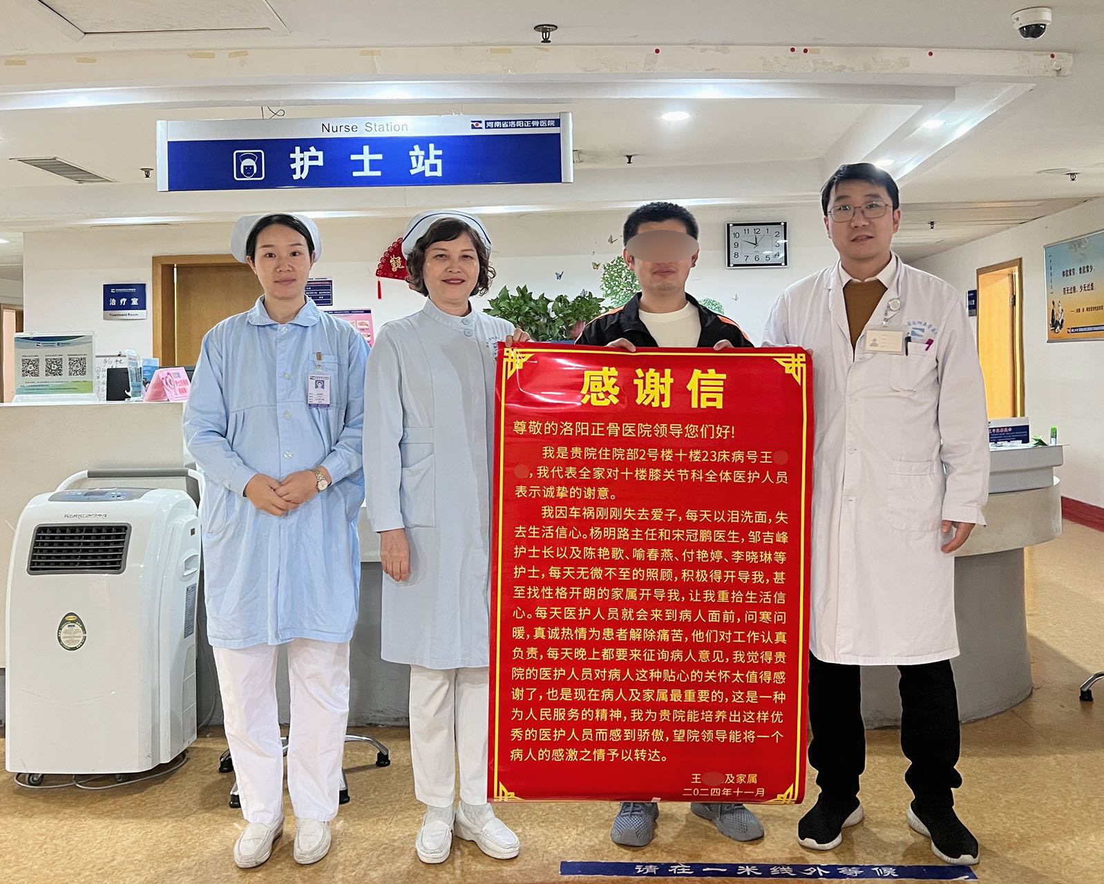 王女士因车祸受伤、痛失爱子,陷入了极度的悲痛之中,生活几乎失去了方向。然而,在我院膝关节外二科住院期间,她得到了科室名誉主任杨明路、医师宋冠鹏、护士长邹吉锋以及护士陈艳歌、喻春燕、付艳婷、李晓琳等医护人员的悉心照料和温暖关怀。医护人员不仅在治疗上尽职尽责,更在精神上给予了她巨大的支持。他们积极开导王女士,找来性格开朗的家属帮助安慰她,帮助她逐渐走出阴霾,重拾生活的信心。