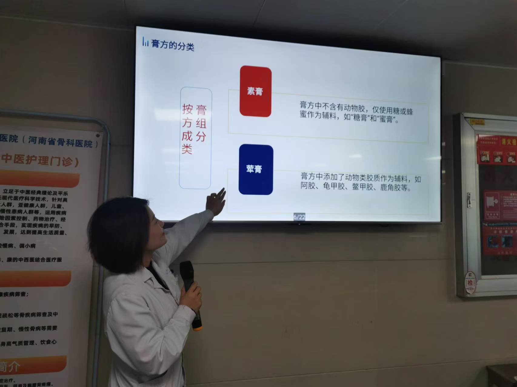 本次活动中,治未病门诊(中医护理门诊)主任黄满玉进行中药膏方临床使用指导;药品调剂科主管药师吕艳艳进行了《中药膏方知识科普—带您认识中药膏方》的膏方科普知识讲座;吕艳艳、陈晓茹、姚瑞娜、裴圆圆、吉建等药学技术骨干,为现场群众和医护人员进行有奖知识问答和疑难解惑;中医护理、治疗专家王桂枝、程月起、张雅晴、段丽娟、南晓静等介绍中医特色治疗项目及治未病门诊参观。活动现场气氛热烈,参与群众络绎不绝。