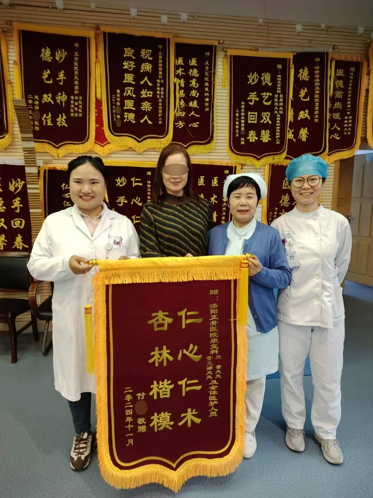 11月15日,我院住院部三号楼六楼骨肌疼痛一科、康复科收到一面锦旗,这是患者付女士为了感谢骨肌疼痛一科医护人员在治疗期间给予的优质治疗而赠送的。