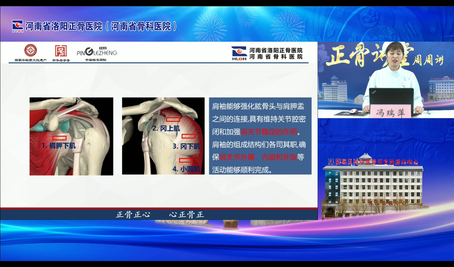 2024年11月20日,“正骨讲堂周周讲”十一月护理专题第三期直播授课顺利开展。讲堂邀请我院肩肘外一科护士长冯瑞萍为大家分享《“肩”负重任 请勿轻“举”妄动--肩袖损伤那些事》。