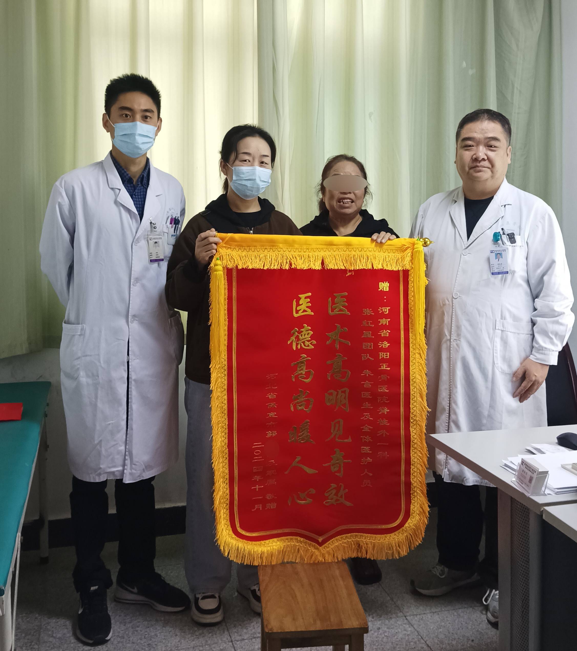 11月12日早晨,来自河北省保定市的患者郭先生的家属满面笑容地手持锦旗,向我院脊柱外一科主诊医师张红星、主治医师朱言及全体医护团队表达真挚的感谢,朴素的语言,沉甸甸的锦旗,代表了医护人员的辛苦付出,也代表了患者对医护人员的信任。