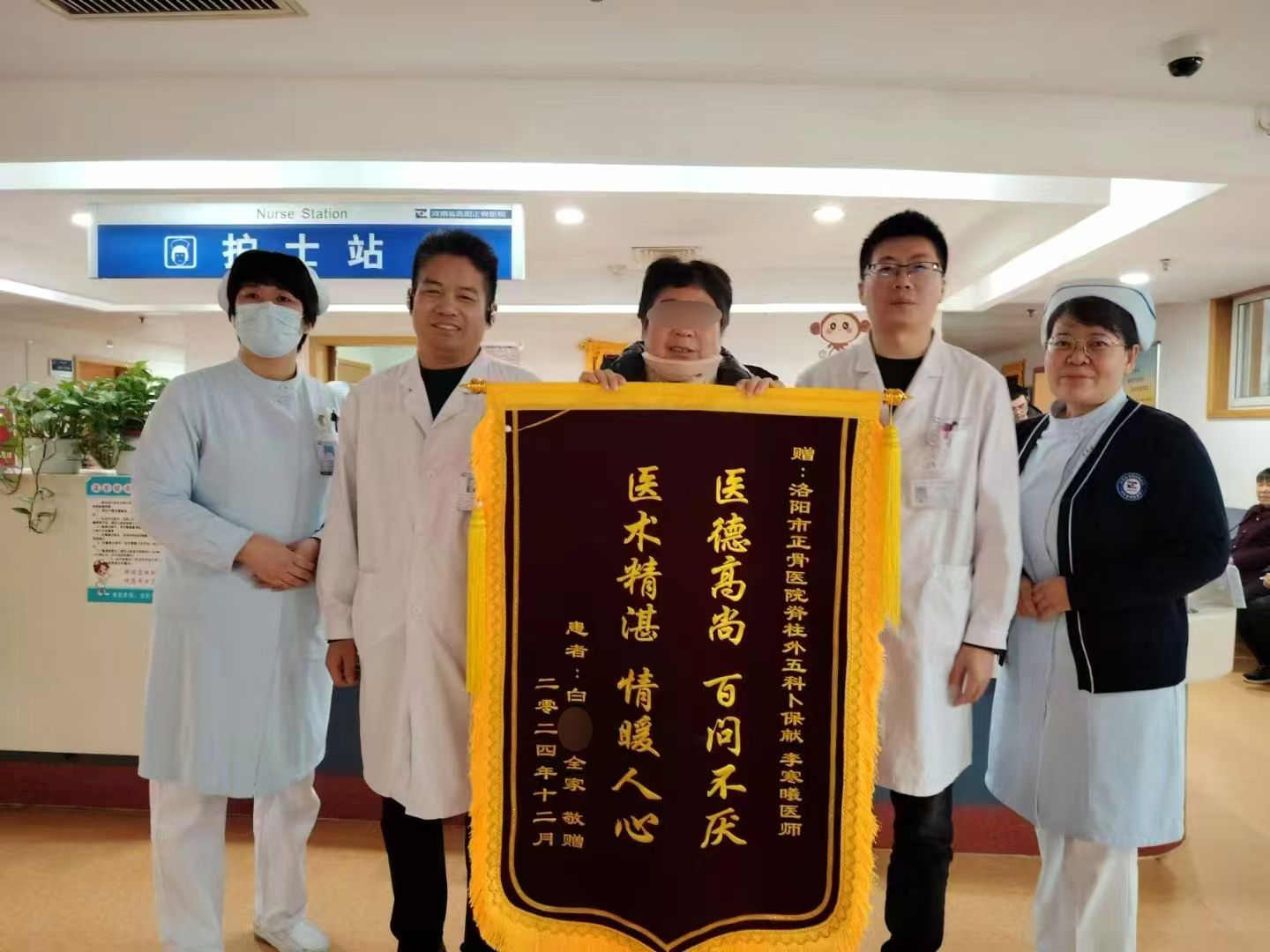 2024年12月2日上午,来复查的患者白女士及家属手捧一面锦旗来到脊柱外五科主任卜保献办公室,感激地说:“谢谢卜主任、李医生及全体医护人员!”