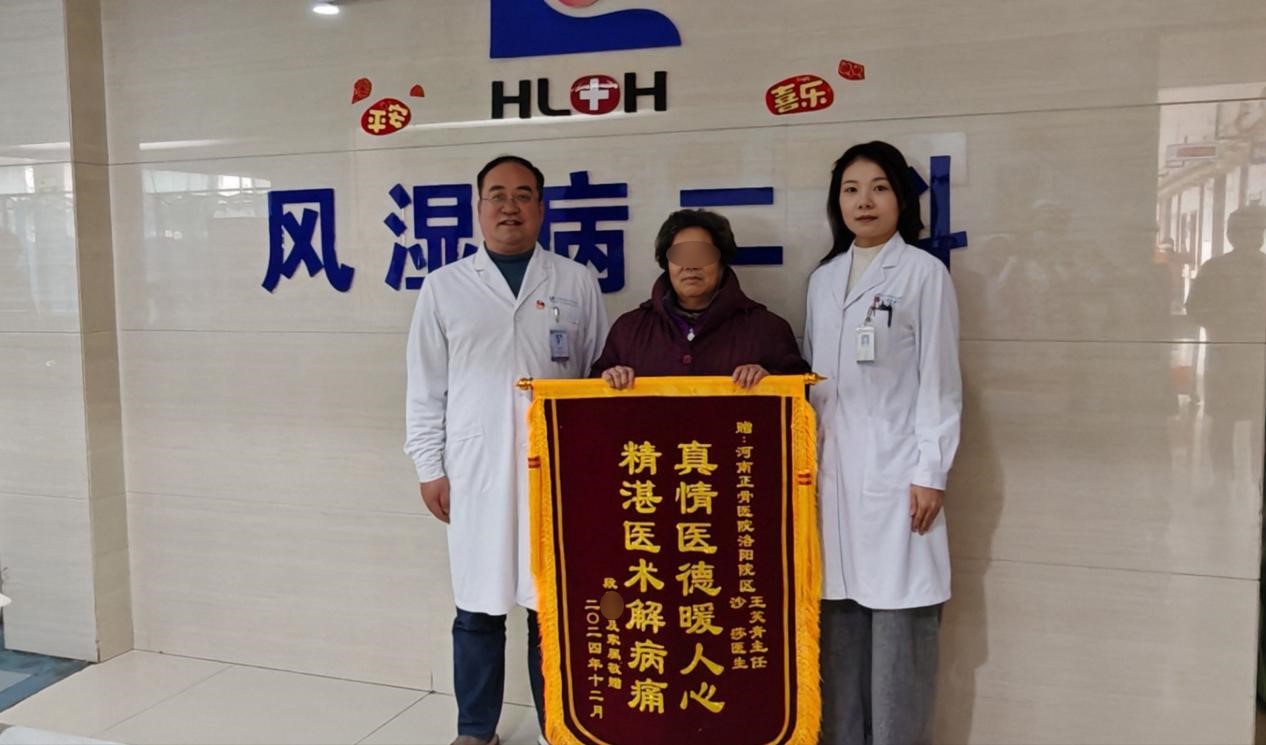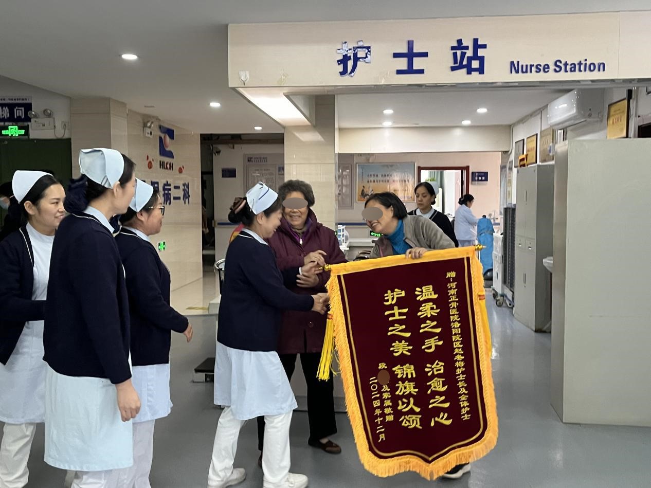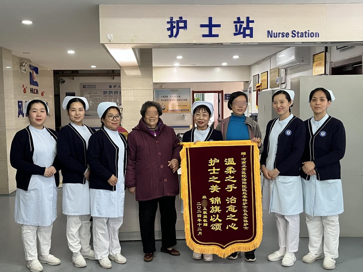 2024年12月9日,84岁的段奶奶来我院复诊,在4号楼3层护士站外,紧握着赵冬梅护士长的手不住的感谢,并特意送来两面锦旗,表达对医护人员深深的感激。段奶奶的女儿在一旁说,段奶奶回家后一直念叨着一定要送锦旗给风湿病二科的医护团队,表达自己的感激之情。