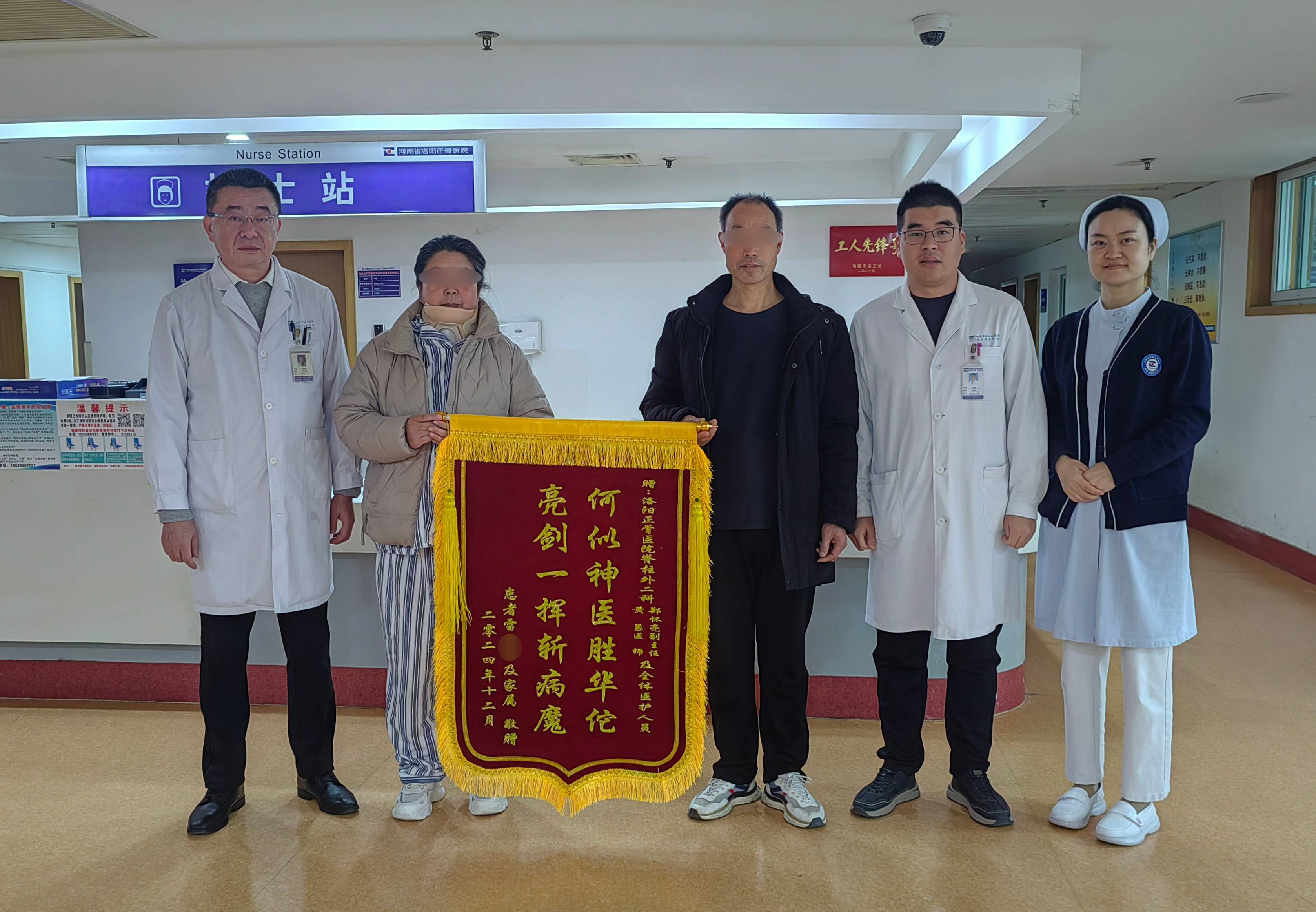 12月10日,脊柱外二科病区发生了感人一幕,患者雷女士满怀感激地将一面锦旗送到了脊柱二科主诊医师郑怀亮和黄勇医师手中,锦旗上写着“何似神医胜华佗,亮剑一挥斩病魔”,简短的话语背后,是一段充满温情与希望的医患故事。