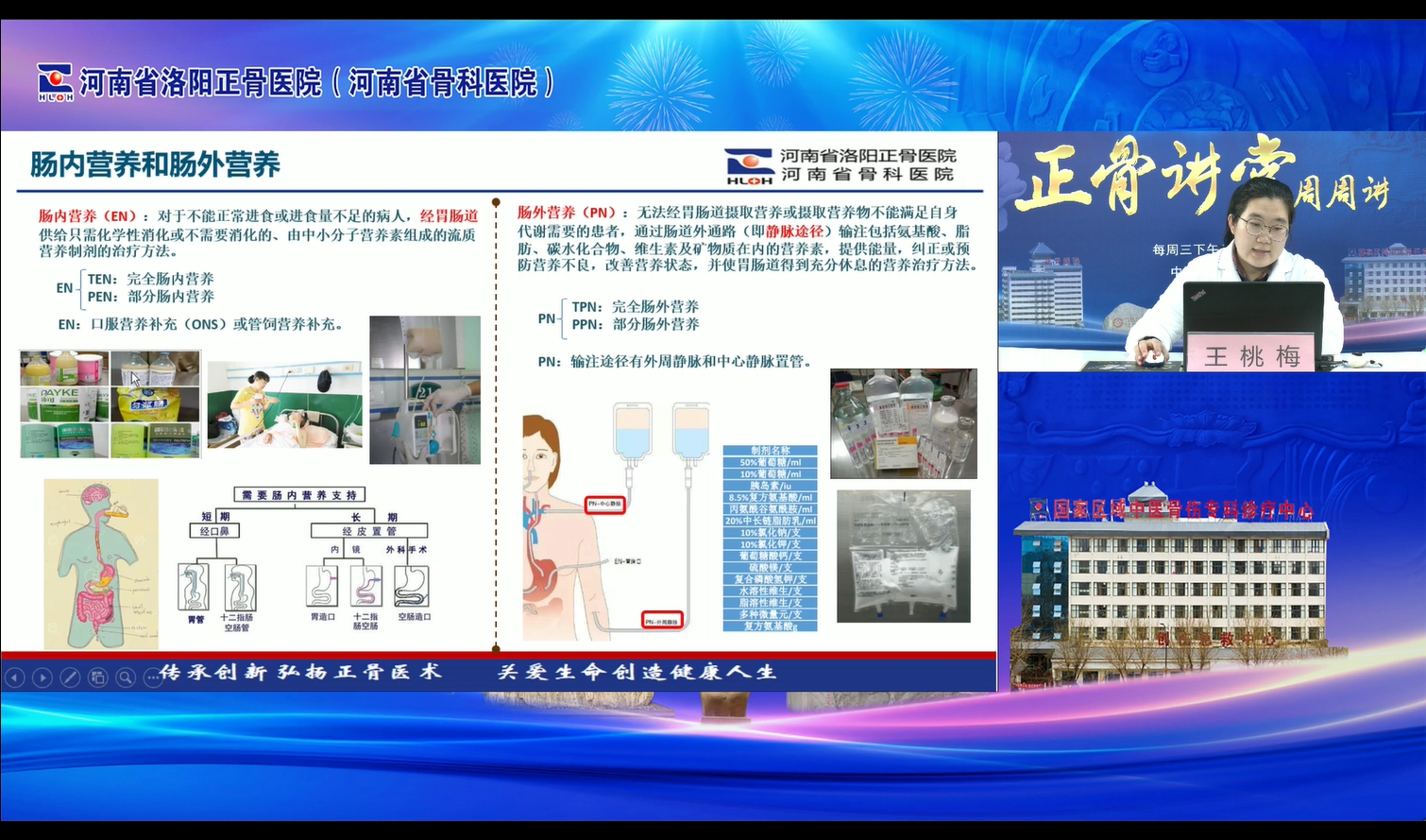 2024年12月11日,“正骨讲堂周周讲”十二月营养专题第一期直播授课顺利开展。本期讲堂邀请我院住院部营养师王桃梅为大家分享《肠内营养治疗》。