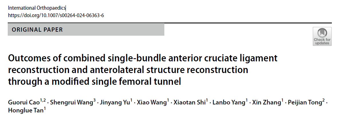近日,我院膝关节外四科谭红略主任、曹国瑞医师团队原创文章《Outcomes of combined single-bundle anterior cruciate ligament reconstruction and anterolateral structure reconstruction through a modified single femoral tunnel(股骨共骨道联合重建前交叉韧带韧带和前外侧结构)》于2024年11月在《International Orthopaedics》杂志在线发表,其中曹国瑞医师为论文第一作者,谭红略主任为论文通讯作者,史小涛医师、王啸医师,张鑫医师和杨澜波主诊医师等为论文共同作者。该杂志为骨科领域综合性权威杂志,国际矫形与创伤外科学会(SICOT)会刊,以报道全球骨科领域原创性内容为主。