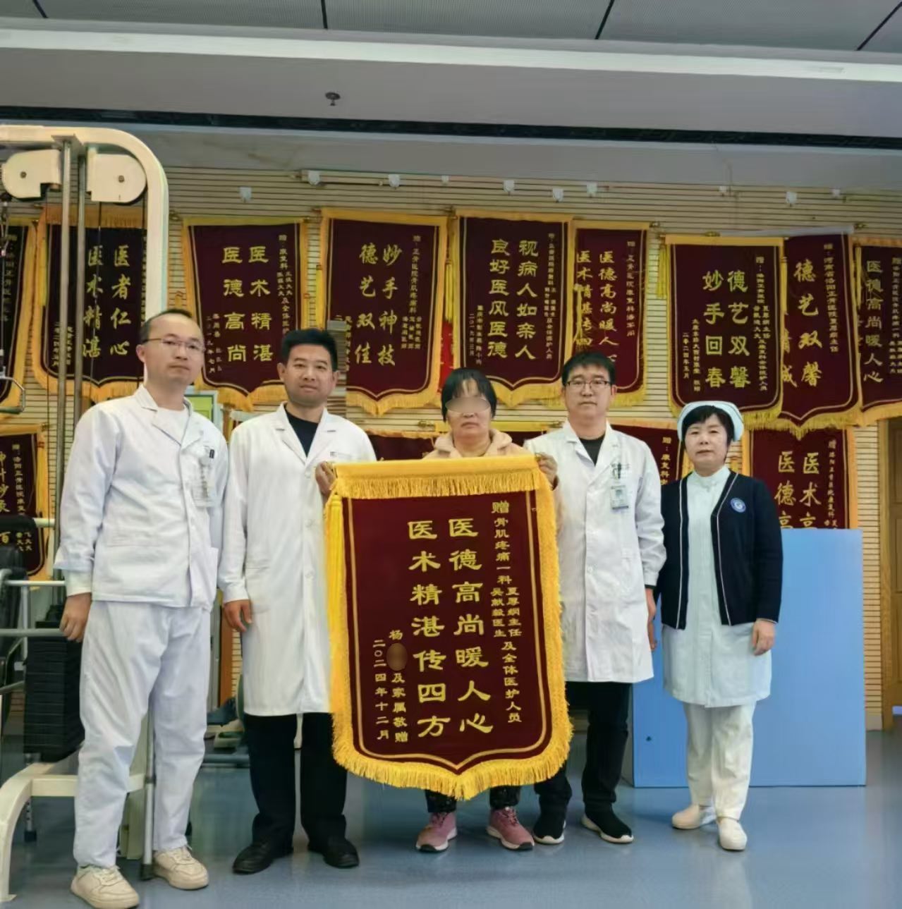 在这个寒风凛冽的日子里,我院骨肌疼痛一科迎来了一幕温馨而感人的画面,令每个医护人员都如沐春风。患者杨女士因外伤导致右上肢、腰部及右下肢疼痛不适于今年十月份在我院接受治疗。在治疗期间,我院骨肌疼痛一科的医护人员不仅提供了专业的医疗服务,还给予了患者极大的心理支持和关怀。