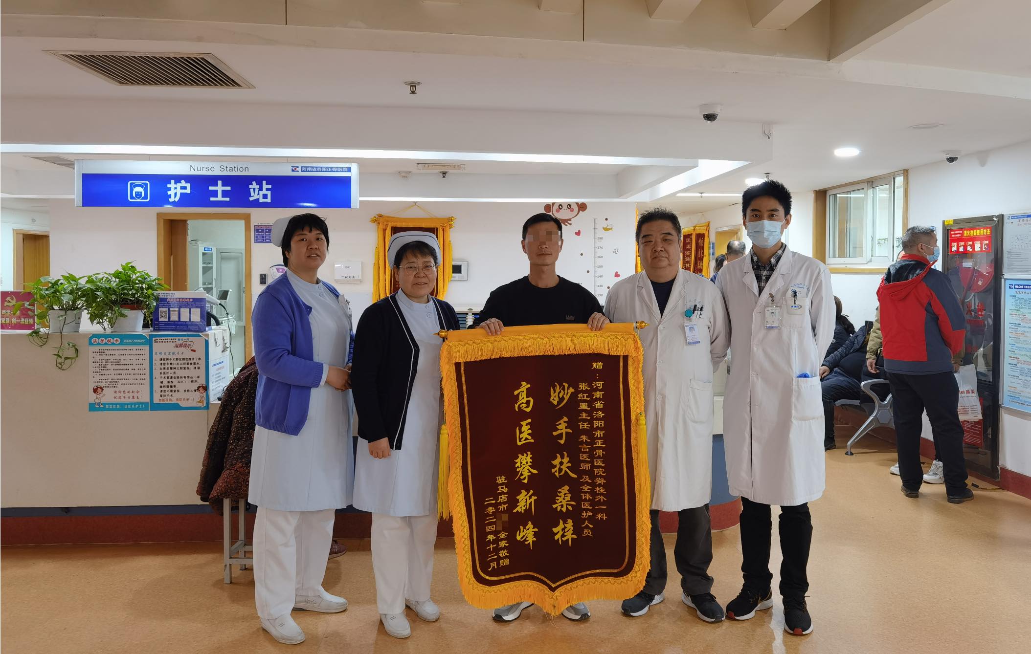 患者节师傅因外伤导致腰椎骨折在我院接受治疗。在治疗期间,脊柱外一科主诊医师张红星及朱言主治医师为节师傅制定了详细的诊疗计划和手术方案,给予了患者极大的心理支持和关怀。同时护理团队提供个性化中医特色护理治疗方案,时刻关注病情变化,及时调整治疗方案,以细致入微的关怀和耐心,确保每一步治疗都精准有效。经过治疗,节师傅疼痛减轻,生活质量显著提高,治疗效果满意,为感谢医护人员的辛勤付出与无私奉献,节师傅及家属特意定制并送来锦旗,不仅代表感激之情,更是对所有医护人员辛勤工作的肯定与赞扬。