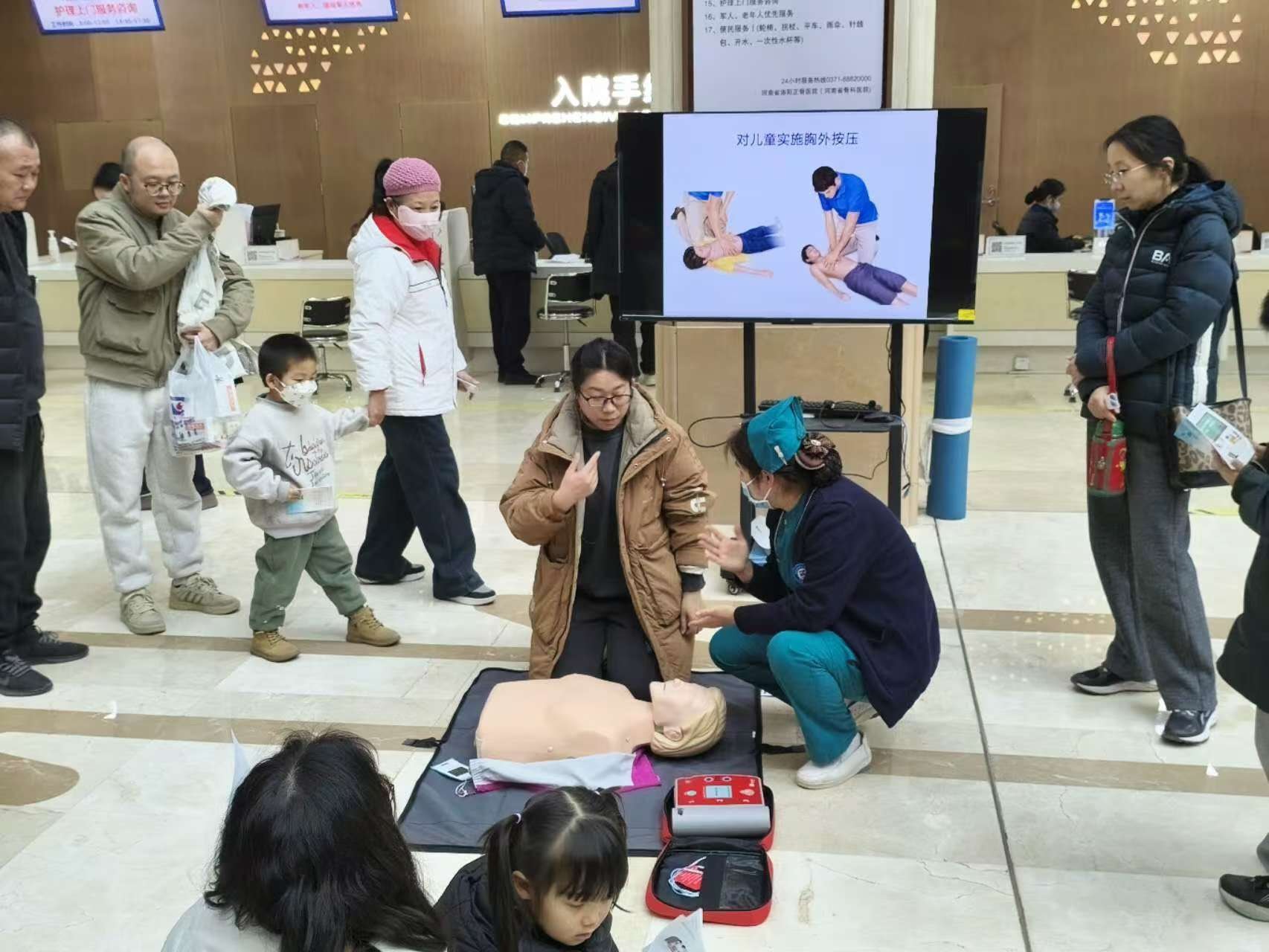 活动在门诊一楼大厅拉开帷幕。郑州院区急诊科医护人员精心准备了丰富的急救知识内容,通过理论讲解、现场演示和互动教学相结合的方式,向患者及陪护人员传授了心肺复苏、海姆立克急救法等实用的急救技能。医护人员用通俗易懂的语言,详细讲解了急救的黄金时间、操作要点及注意事项,并通过模拟人进行现场演示,让复杂的急救知识变得简单易懂。