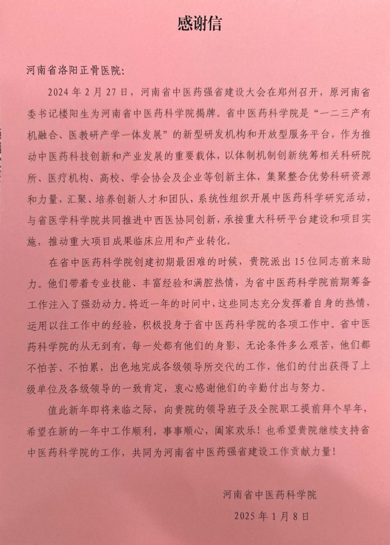 近日,我院收到来自河南省中医药科学院的感谢信,对我院派出的15位同志辛勤的工作表示肯定,也对我院对省中医药科学院工作的支持表示感谢。