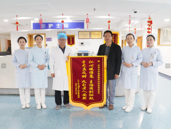 今日上午,阳光倾洒在河南省洛阳正骨医院(河南省骨科医院)髋关节外四科,一面红底金字的锦旗在晨光中格外醒目。“仁心暖伤患,主治周到细致,手术真及时,九旬老人安然”的烫金大字,不仅照亮了整间科室,更见证着医患之间的温情故事。患者家属赵先生感激的说:“我90岁高龄的岳母在年关时遭遇这样的意外,是你们给了我们希望和信心!”