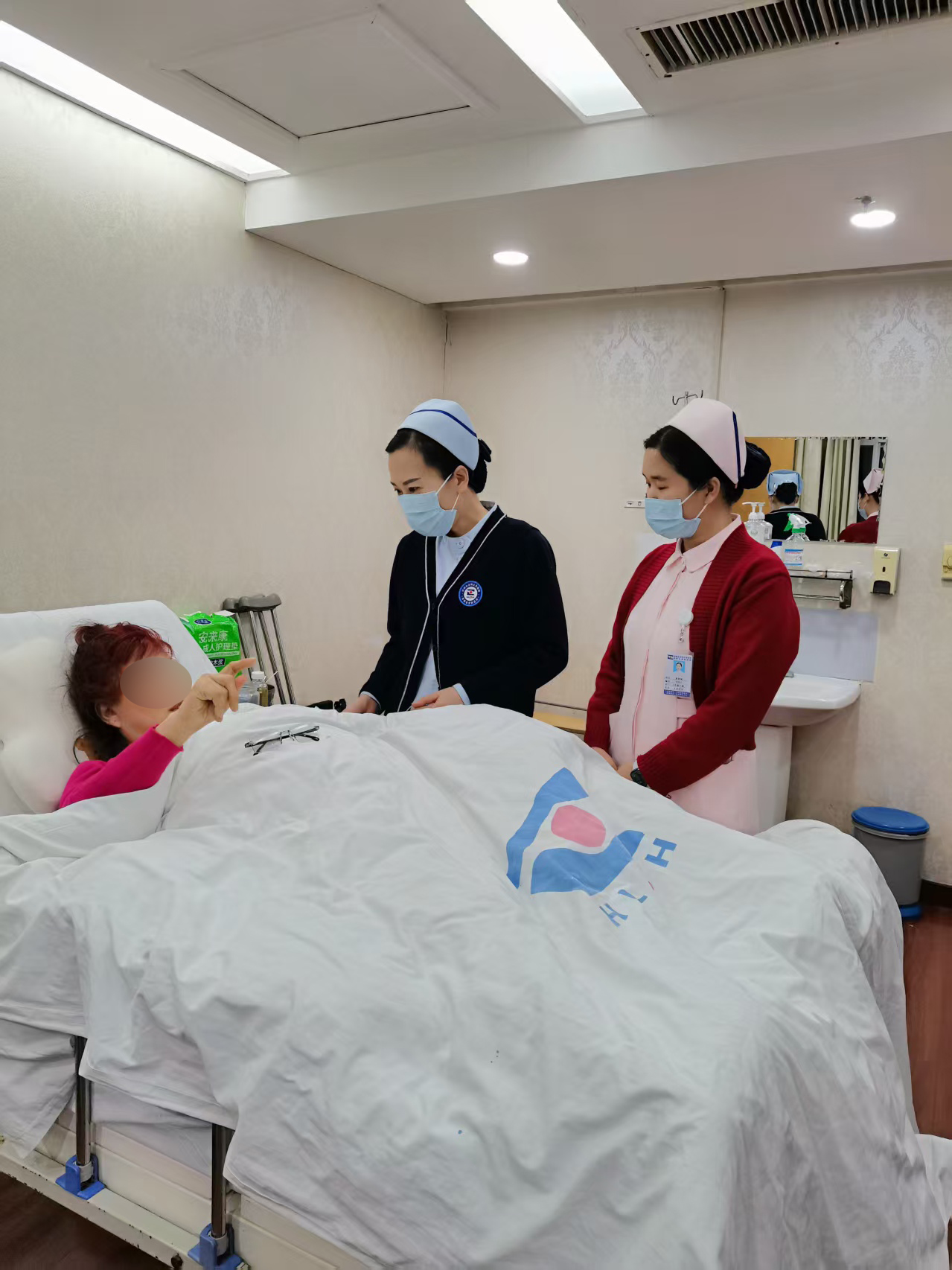 术后康复期,护士长王桂芝的身影成为病房最温暖的风景。她带领护理团队定制专属护理计划,从创口换药到预防血栓,从营养餐搭配到心理疏导,每个细节都倾注关怀。王女士因卧床焦虑失眠抑郁时,王桂芝护士长握着她的手轻声安慰;康复训练疼痛难忍时,她化身“天使”鼓励患者坚持。