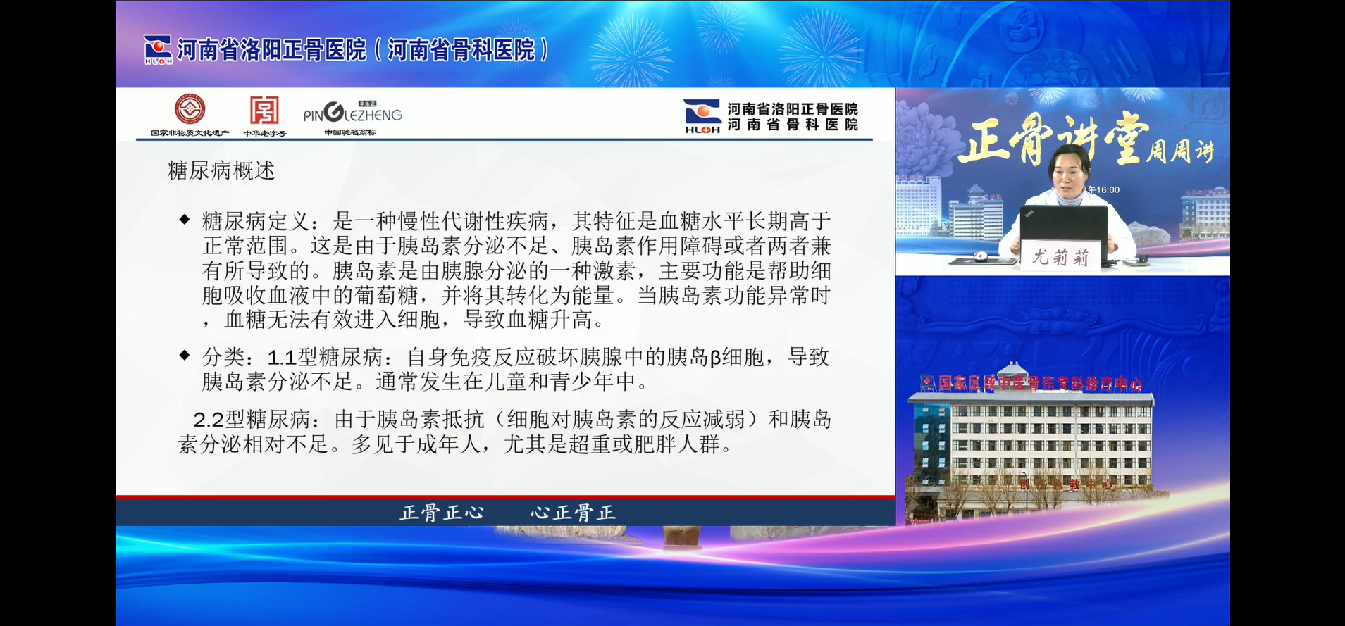 2025年2月26日,“正骨讲堂周周讲”一、二月系列讲座第四期直播授课顺利开展。本期讲堂邀请我院重症医学科副主任医师尤莉莉为大家分享《您的血糖达标了吗?》。