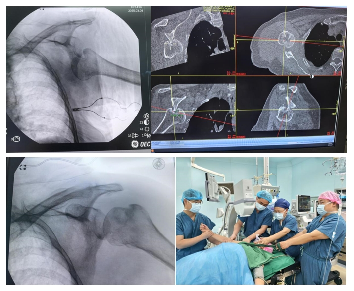 入院后,赵俊峰主诊团队根据患者的实际情况,在整复前设计阶段,完善肩关节CT检查后发现,患者肩关节脱位合并有肱骨大结节骨折,同时注意到患者骨质疏松严重,如果治疗过程中技巧和力度掌握不当,很容易造成骨折,这对手法复位增加了较大难度。和麻醉医师沟通后,赵俊峰团队在麻醉监护下采用平乐牵引回旋法进行复位,这样既安全,又能有效缓解患者疼痛。