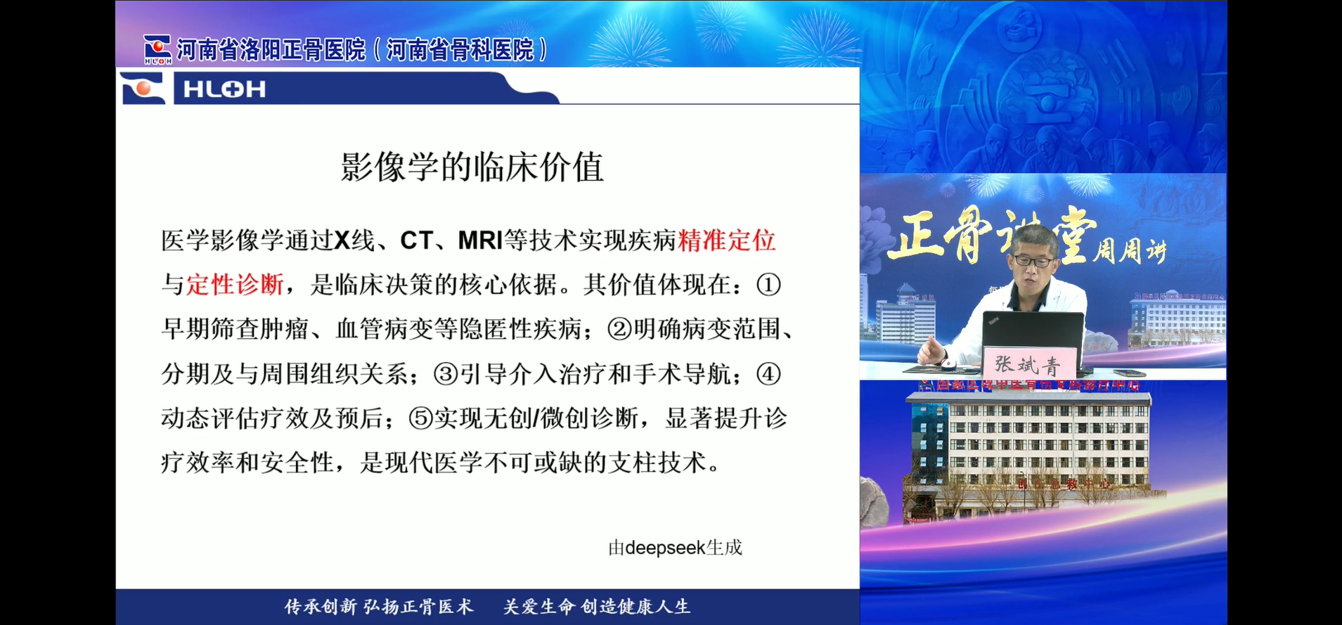 2025年3月12日,“正骨讲堂周周讲”三月影像系列讲座第二期直播授课顺利开展。本期讲堂邀请我院影像中心张斌青主任医师为大家分享《骨髓水肿征象,从横向到纵向分析》。