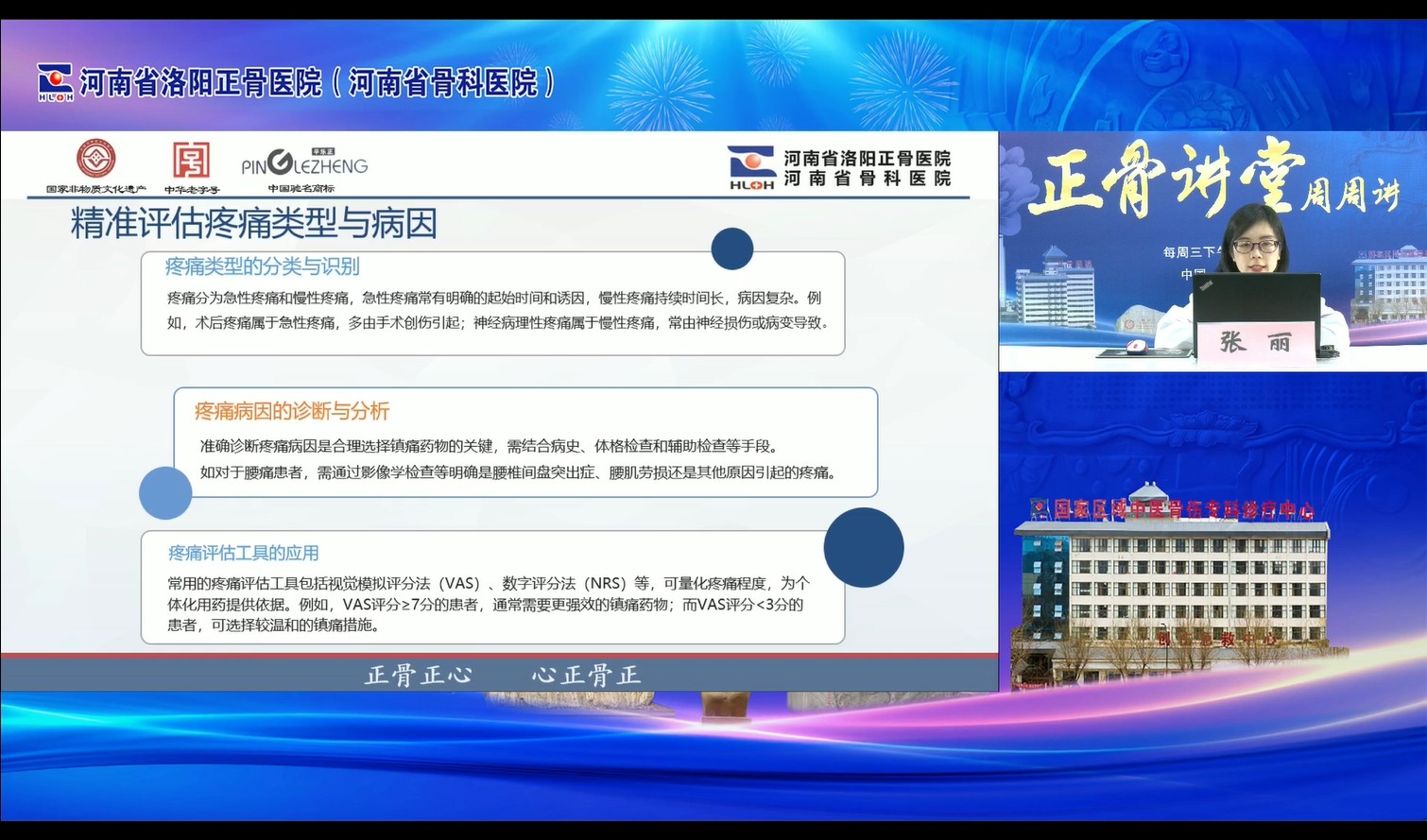 2025年4月9日,“正骨讲堂周周讲”四月药学系列讲座第二期直播授课顺利开展。本期讲堂邀请我院临床药学研究室主管药师张丽为大家分享《特殊人群镇痛药物的选择》。