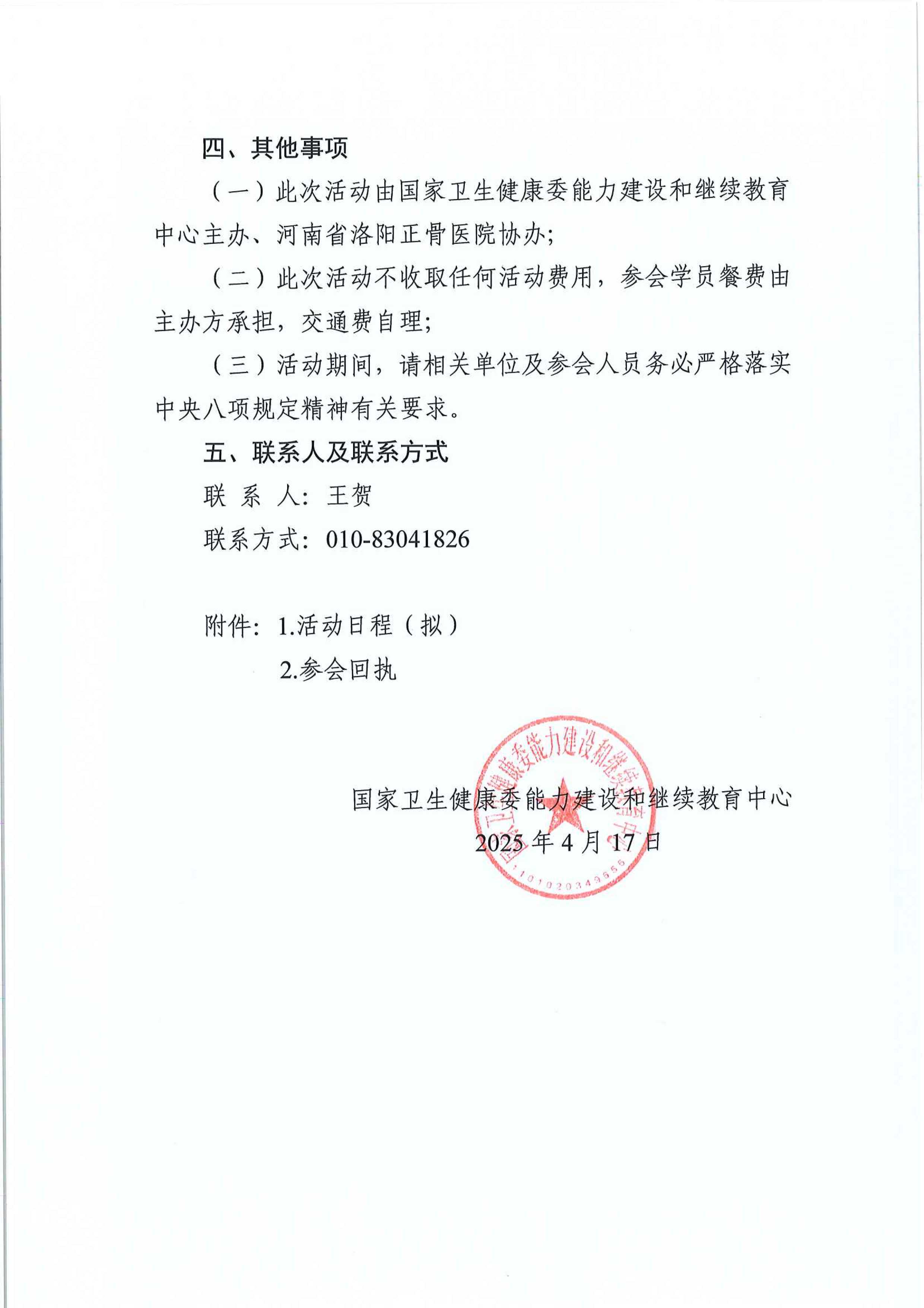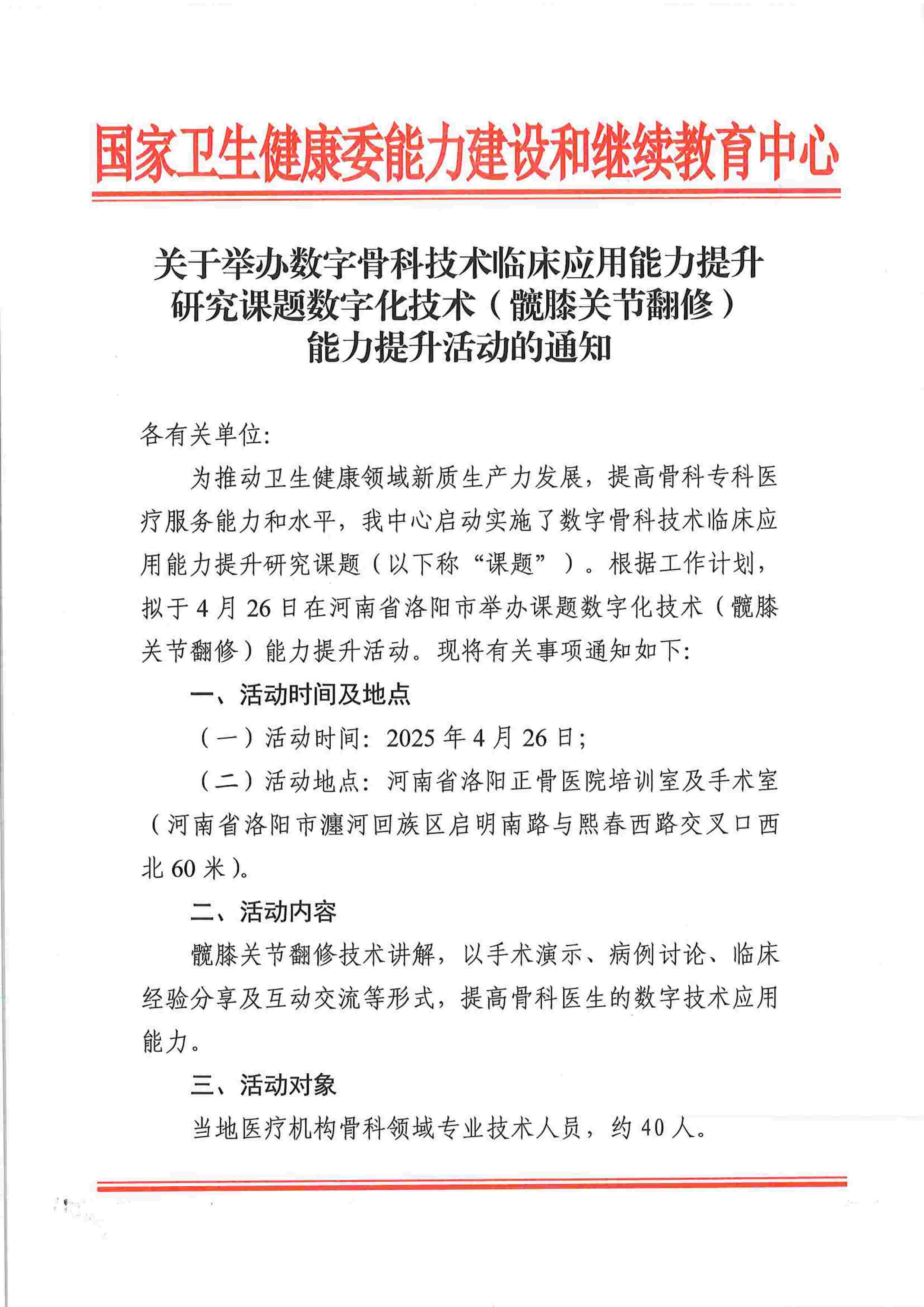 为推动卫生健康领域新质生产力发展,提高骨科专科医疗服务能力和水平,由国家卫生健康委能力建设和继续教育中心主办、河南省洛阳正骨医院(河南省骨科医院)协办的“数字化技术(髋膝关节翻修)能力提升活动”将于2025年4月26日在河南省洛阳正骨医院(河南省骨科医院)举办,届时将邀请北京积水潭医院周一新教授、杨德金教授、邵宏翊教授作手术演示和经验分享,欢迎参会!