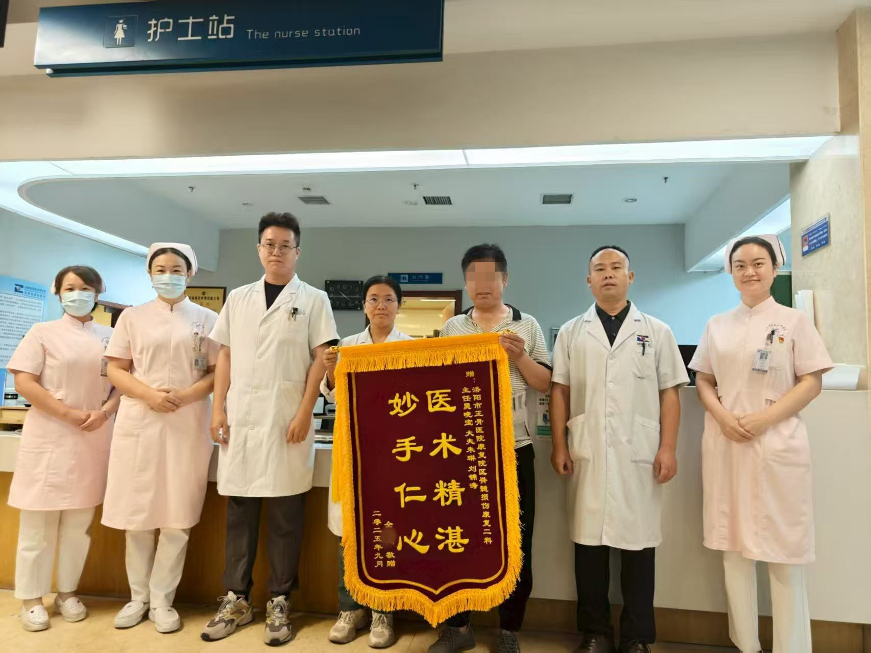 患者仝先生于2024年12在煤矿工作时不慎被重物砸伤,行腰椎手术治疗后好转出院。患者伤后饱受“腰骶神经损伤、胫神经损伤”的折磨而入院,经常出现腰痛、右下肢及右足底烧灼样疼痛、跛行,大便控制不住等症状,严重影响患者生活质量,遂至我院康复院区脊髓损伤康复二科就诊。在主诊组长晁晓宝,医师朱琳、刘锦涛的精心治疗与护士长郭金惠带领的护理团队悉心护理下,患者腰痛、右下肢及右足底烧灼样疼痛等症状明显改善,生活质量显著提高,患者赠旗盛赞“医术精湛 妙手仁心”。
