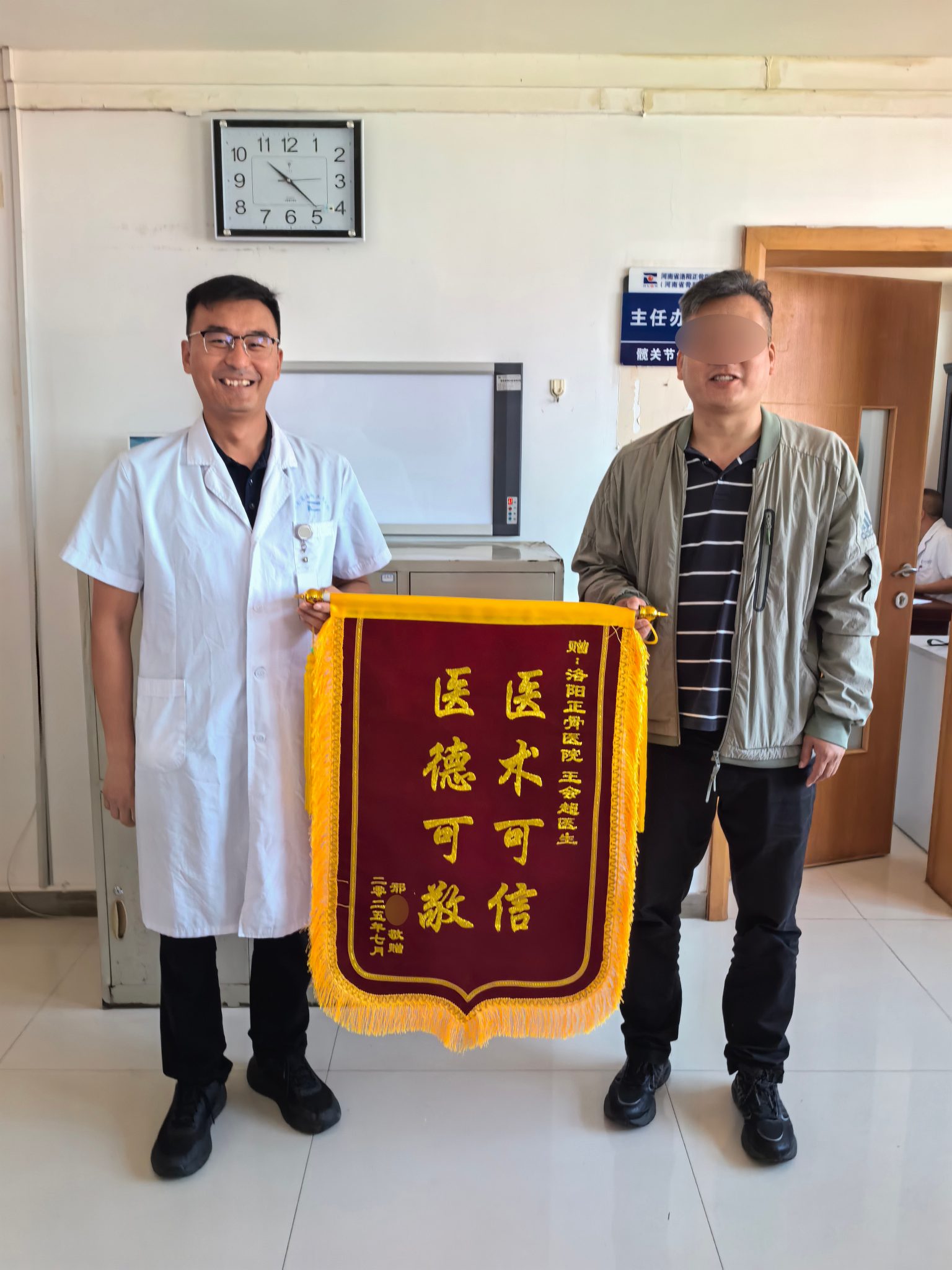 近日,我院洛阳院区髋关节外三科医生办公室内上演了温馨一幕:一位13岁男孩的父亲在孩子术后两个月,将一面写有“医术可信,医德可敬”的锦旗,郑重交到主治医生王会超手中。