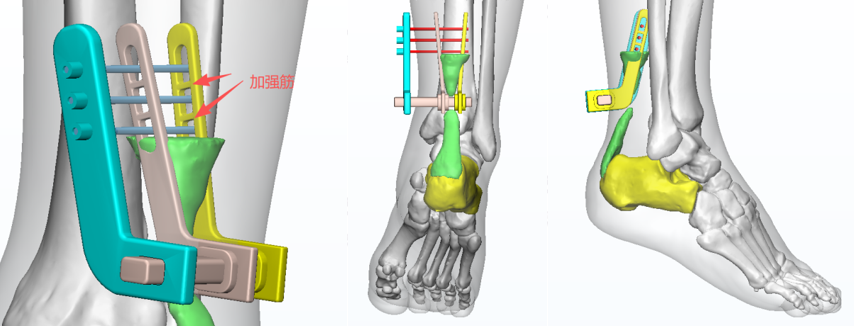 通过患者CT扫描数据,团队进行三维重建,1:1完整呈现患者跟腱断裂的部位、断端间隙、周围血管等关键结构,优化切口位置、模拟针路、缝线走向,提前发现可能的神经血管冲突,从而降低手术风险。基于患者专属的三维模型,设计置针定位导板,使针孔、导向槽与患者实际解剖结构精准匹配。