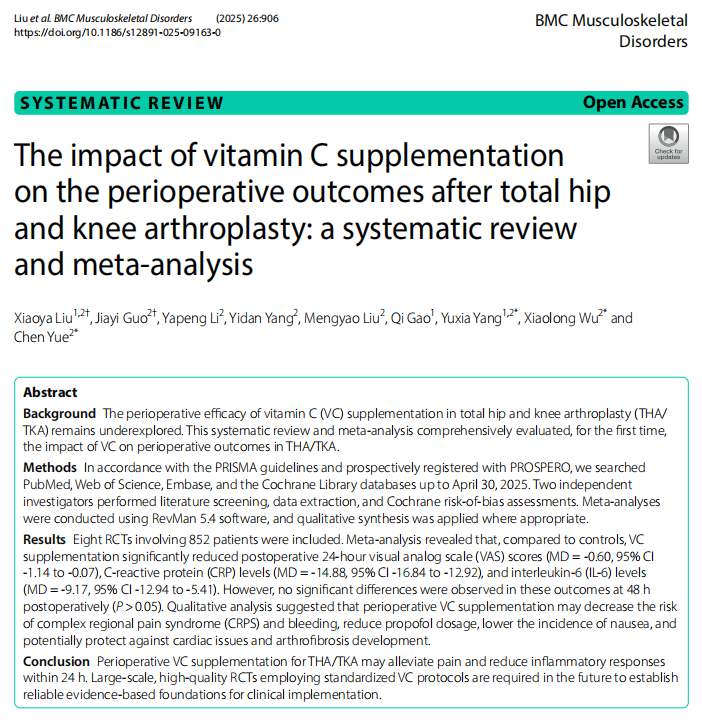 近日,我院与福建中医药大学联合培养的 2023 级护理专业在读研究生刘肖雅同学,以第一作者在 SCI 杂志《BMC Musculoskeletal Disorders》(JCR 骨科 2 区,IF: 2.4)上发表了题为《The impact of vitamin C supplementation on the perioperative outcomes after total hip and knee arthroplasty: a systematic review and meta-analysis》的论文。