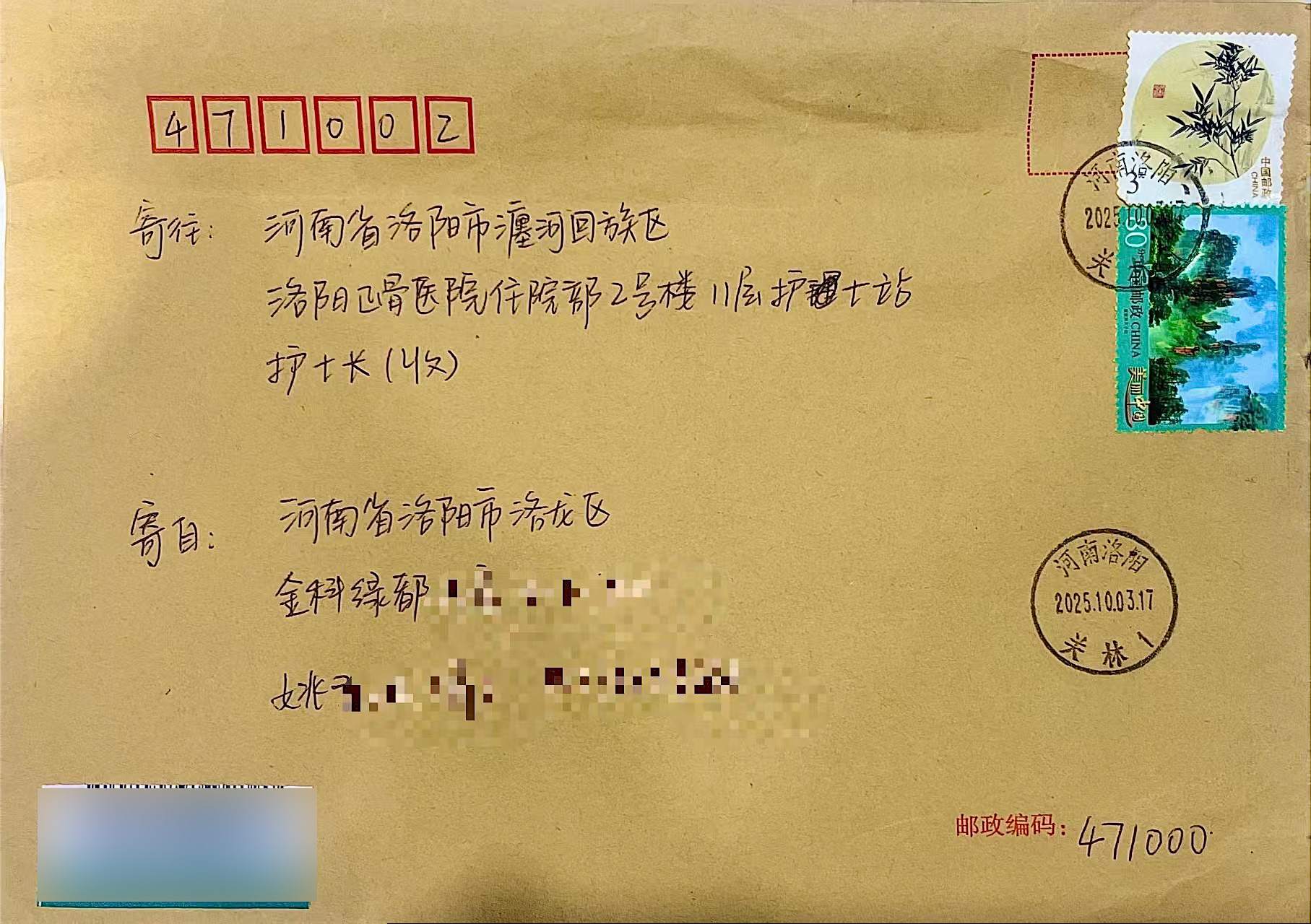 近日,我院洛阳院区髋关节外四科、膝关节外一科护理单元收到了一封贴着邮票的信。在这个互联网发达的时代,收到手写的信,确实是一件少见的事情。原来是一位韧带重建术患者姚女士写下的情真意切的感谢信。信中,她没有过多描述手术的成功,反而反复提及术后那段最焦虑、最无助的日子。这封信,把大家的记忆拉回了一个月前,那场技术与心灵并重的康复护航。