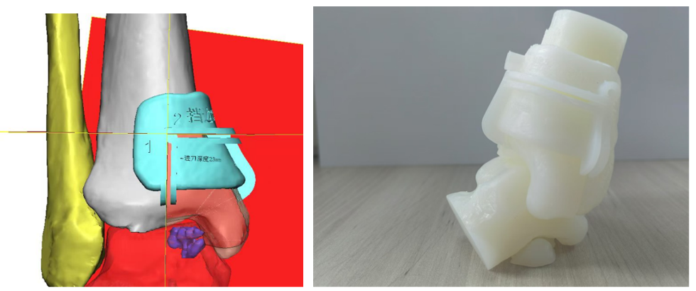 术前,团队基于患者CT数据,1:1精准打印出患侧踝关节模型,并依此设计制作了个性化的截骨导板。这一技术实现了对截骨位置、角度及范围的量化预规划,使手术方案更加直观、可控。