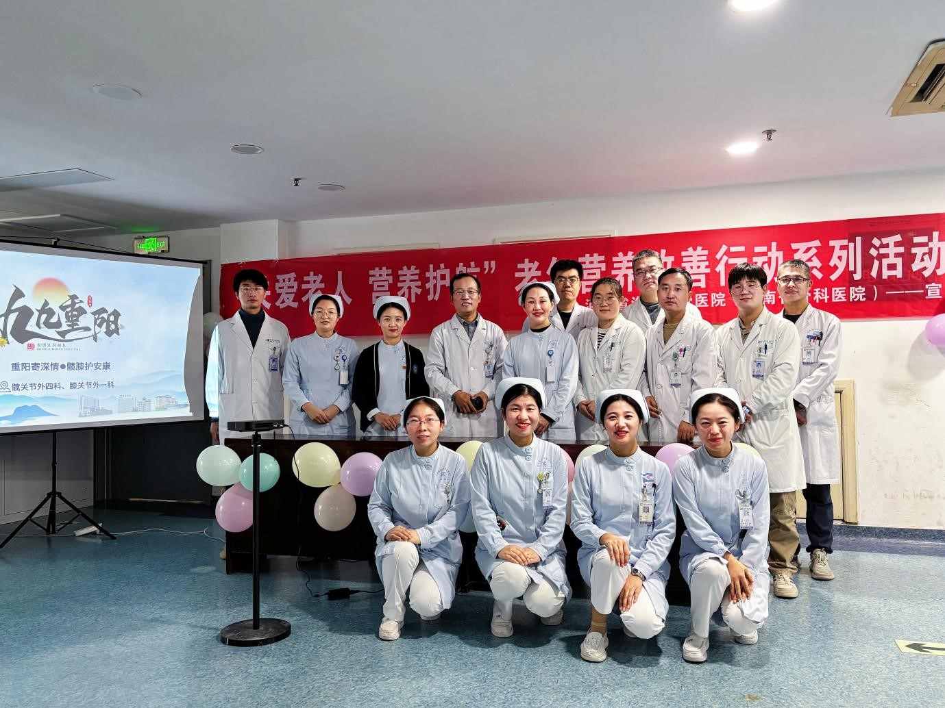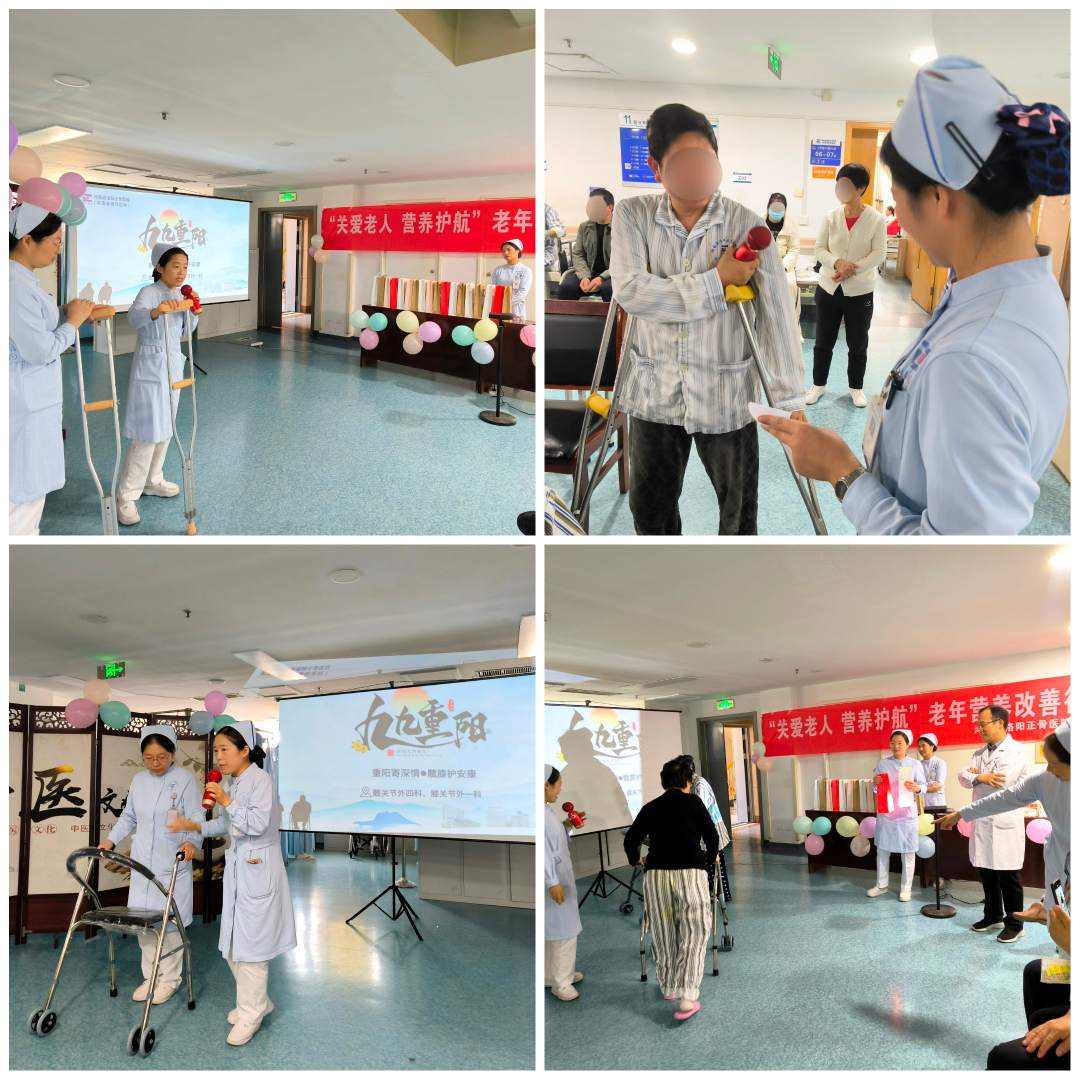 秋来又重阳,情暖在病房。重阳敬老,情意深长。为弘扬中华民族孝老爱亲的传统美德,切实关爱老年朋友的身心健康,在重阳节来临之际,我院洛阳院区髋关节外四科、膝关节外一科病区联合营养科,于2025年10月28日下午,在病区大厅精心策划并举办了一场以“重阳寄深情、髋膝护安康”为主题的重阳节医患科普互动活动,积极响应我院“关爱老人、营养护航”老年营养改善行动系列活动。本次活动旨在为在院患者,特别是老年患者送去节日的温暖与关怀,同时传递科学的健康营养知识与康复理念。