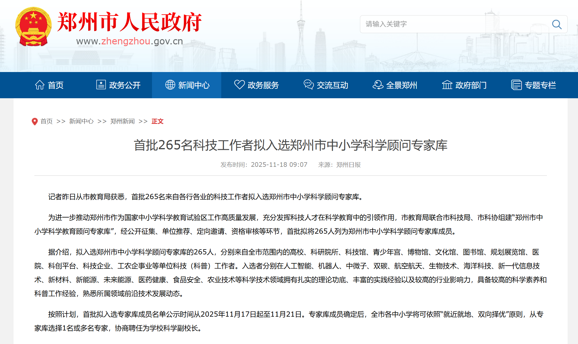 本次入选的265名科技工作者来自医院、高校、科研院所等机构,分别在其科学技术领域拥有扎实的理论功底、丰富的实践经验以及较高的行业影响力,具备较高的科学素养和科普工作经验,熟悉所属领域前沿技术发展动态。随后,郑州市各中小学将依照“就近就地、双向择优”原则,从专家库选择1名或多名专家,协商聘任为学校科学副校长。