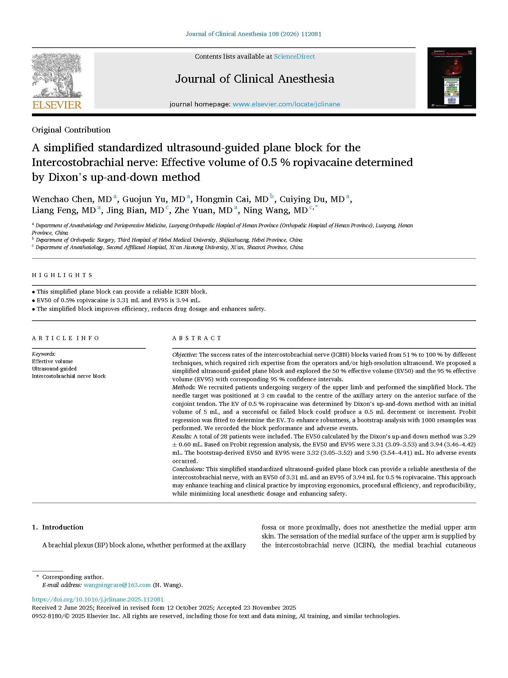 近日,我院洛阳院区麻醉与围手术期医学科团队的原创研究论文《一种简化的标准化超声引导肋间臂神经平面阻滞:采用Dixon上下法确定 0.5% 罗哌卡因的有效容量》,正式在线发表于国际麻醉学领域顶级期刊《Journal of Clinical Anesthesia》。该期刊为SCIE收录期刊,位列JCR麻醉学科Q1区、中科院医学大类2区,影响因子达5.1,是全球麻醉学界公认的核心学术交流平台,其发表成果代表该领域前沿发展水平。