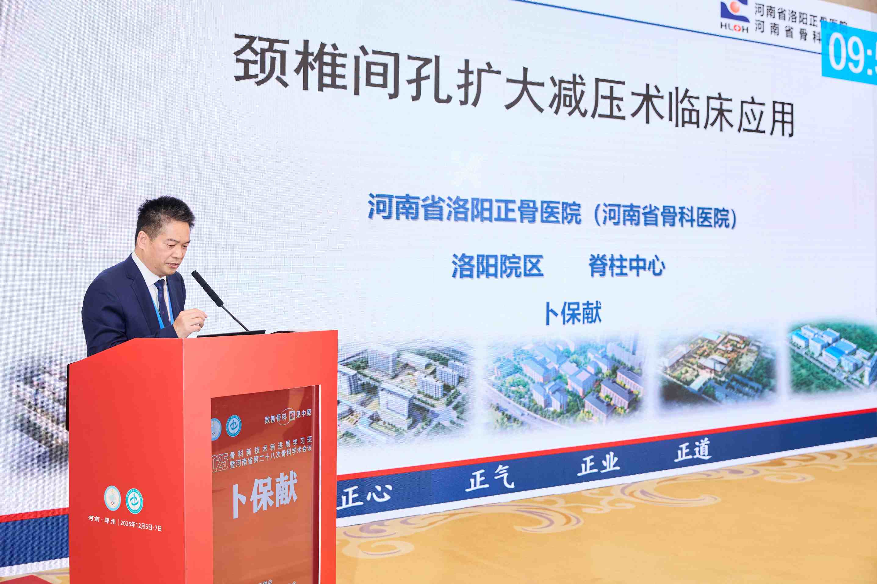 脊柱外科会场,洛阳院区脊柱外科诊疗中心副主任卜保献主持了第二节会议报告,并进行了“颈椎椎间孔扩大术后的临床应用”的精彩学术报告,将洛阳正骨的颈椎高超手术技术分享给与会专家,并与脊柱外四科主诊组长杨磊应邀为讨论嘉宾。