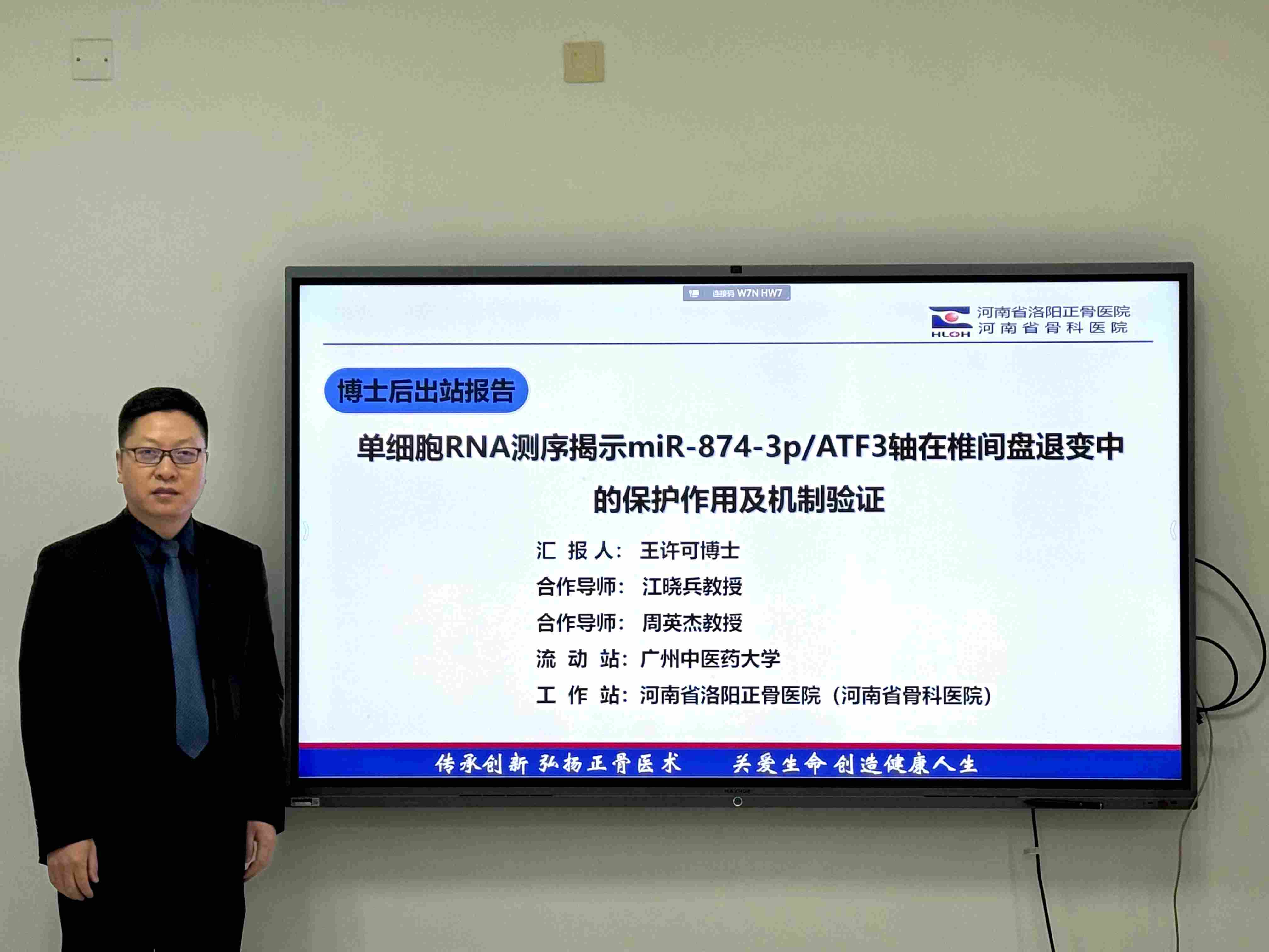 王许可博士后的导师分别为广州医科大学附属第二医院江晓兵教授(线上)和我院脊柱外科诊疗中心周英杰教授(线上)。出席报告会的评审专家有:河南中医药大学第一附属医院丁永利教授、河南中医药大学第三附属医院韩崇涛教授、阜外华中心血管病医院晋果果教授以及我院郭珈宜教授、秦娜教授。我院科研学科办主任张虹主持会议,侯梦晗担任报告会秘书。