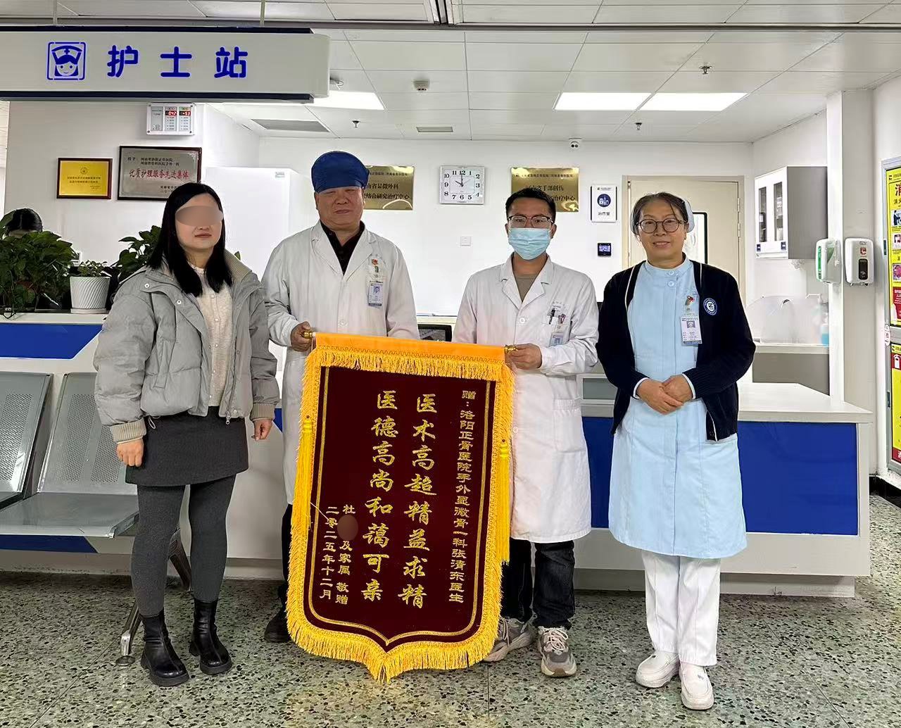 近日,在我院洛阳院区手外显微骨一科的医生办公室和护士站,同时挂上了两面崭新的锦旗。与往常不同,这两面锦来自同一位出院患者杜先生及其家属。他们用这种“特别”的方式,分别向以张耘主任带领的医疗团队和以赵爱琴护士长带领的护理团队,表达了最诚挚、最细致的感谢。