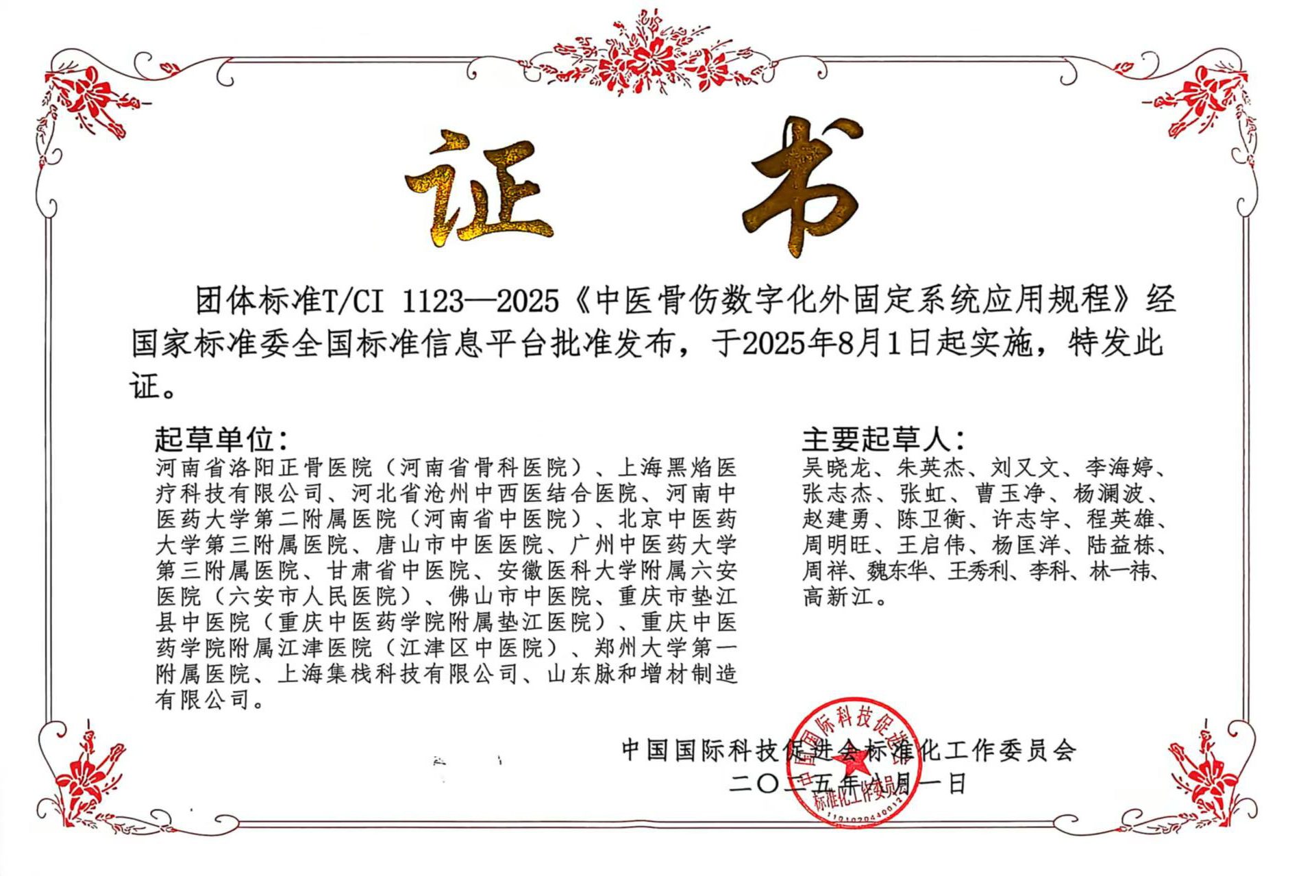 近日,在“中国研究型医院学会医工转化与健康产业融合专委会年会暨上海交通大学医学3D打印创新研究中心全国联盟博创论坛暨第七届医学3D打印与临床转化全国大赛”上,一项里程碑式的团体标准——《中医骨伤数字化外固定系统应用规程》正式发布并举行授牌仪式。该标准由我院牵头制定,院长吴晓龙作为标准起草第一人。该标准的发布标志着中医骨伤治疗迈入数字化、精准化新时代。