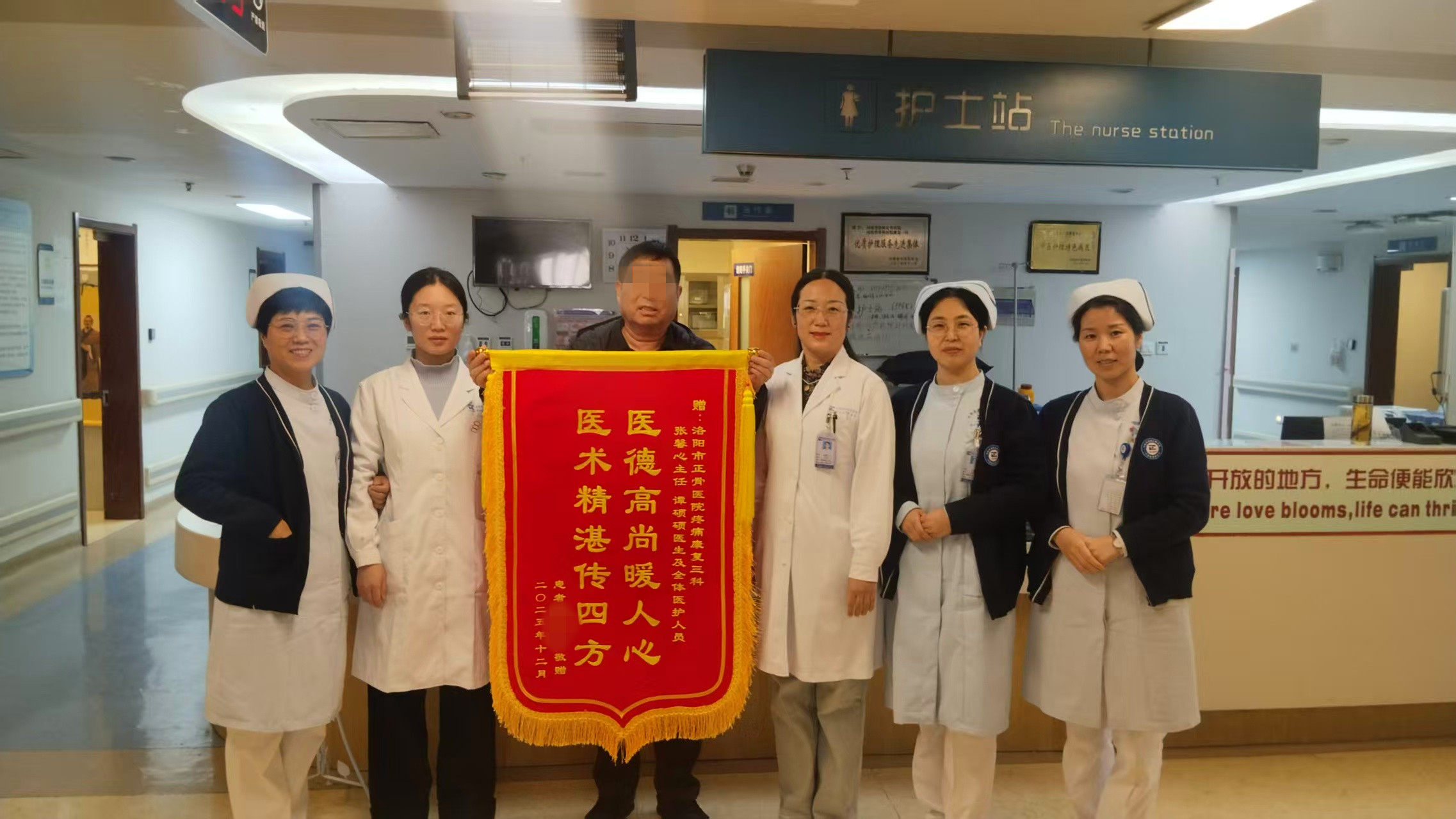 一面锦旗,一份认可,中医整体调理的魅力尽在其中。近日,我院康复院区疼痛康复三科的病房里上演了暖心一幕——因下楼梯不慎扭伤膝关节、手腕的张先生(化名),历经一个多月的系统康复治疗后顺利出院。出院当天,他特意将一面印着“医德高尚暖人心,医术精湛传四方”的锦旗,郑重送到张馨心主任医师带领的医疗团队及全体医务人员手中,用最质朴的方式表达内心的深切感激。