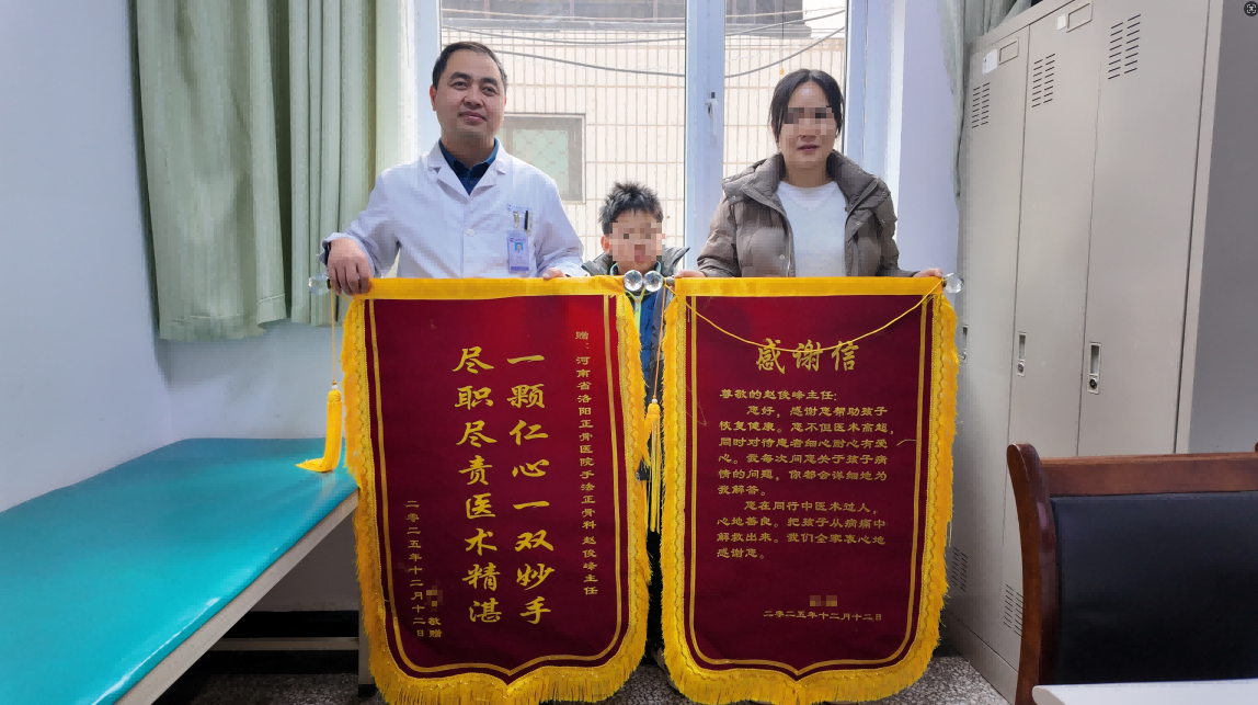 近日,我院洛阳院区手法正骨(微创正骨)一科诊室内暖意融融,八岁的周同学在母亲陪伴下,将一面承载真挚谢意的锦旗送到了科室负责人赵俊峰手中。这名小学三年级学生,自2022年至今,在三年内接连经历了五次不同部位骨折,每一次都通过平乐手法正骨复位手法保守治疗成功康复,全程未进行任何侵入治疗,不仅治愈了伤痛,更完整呵护了孩子的生长发育潜能。