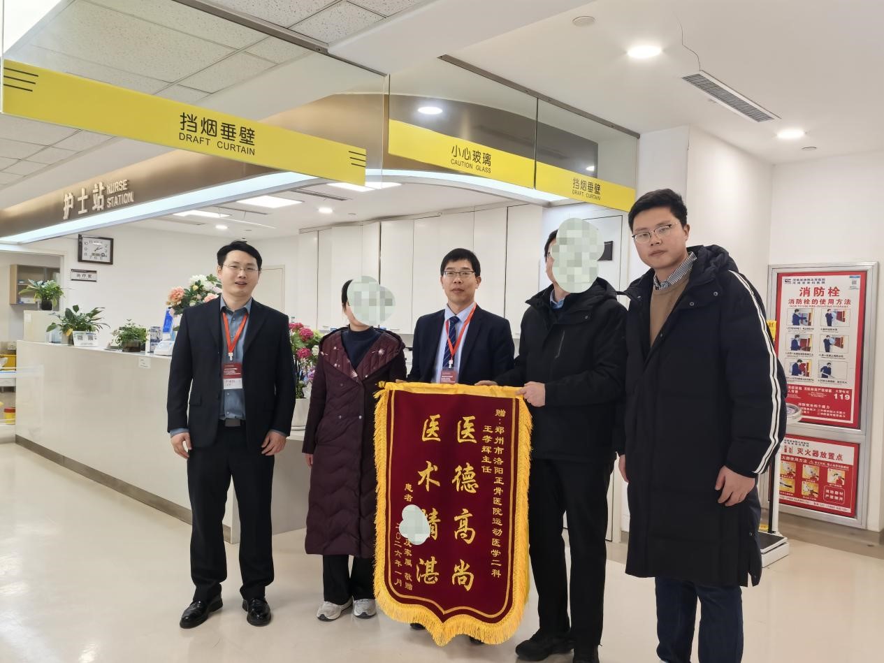 今年,王孝辉主任调至郑州院区工作。杨女士在近期复查时得知这一消息,当即表示:“是王主任让我重新稳稳地站上运动场,这份情谊我一直记在心里。无论主任在哪个院区,我都要当面说声谢谢!”她利用休息时间,专程从三门峡赶赴郑州,将这面承载着满满谢意的锦旗送到了王孝辉主任手中。