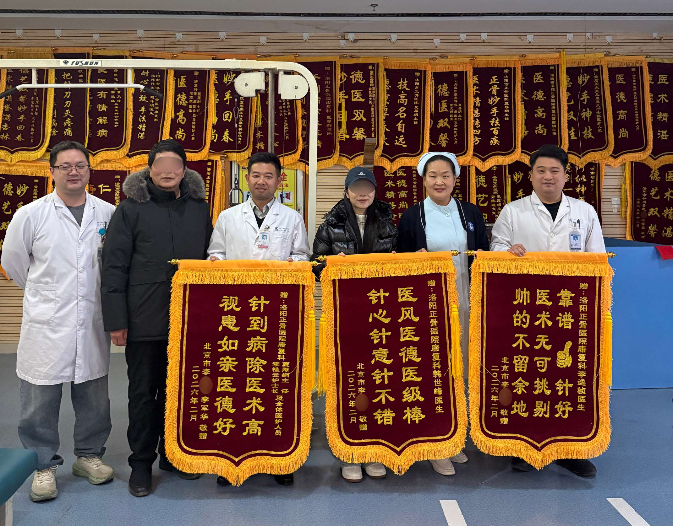 岁序更替,华章日新。临近新春佳节,我院洛阳院区康复治疗部的治疗大厅里,三面鲜红的锦旗格外醒目,这是来自北京患者李女士及其家人李先生一家的真挚感谢,更是对科室医护团队专业诊疗与暖心服务的最高褒奖。