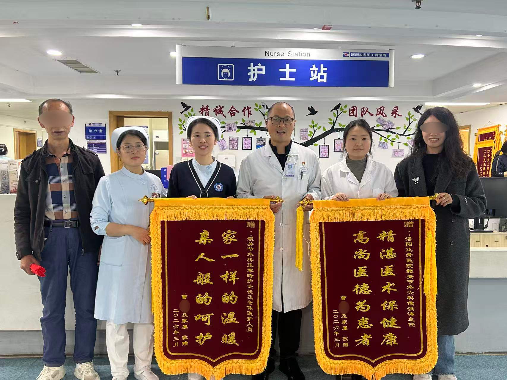 2026年3月11日,对于89岁的曹奶奶及其家属来说是个特别的日子。这一天,曹奶奶顺利出院,她和家属满怀感激地将两面锦旗送到了我院洛阳院区髋关节外六科主诊医师侯洪涛、护士长张军玲以及全体医护人员手中,以此表达对他们精心治疗的深深谢意。