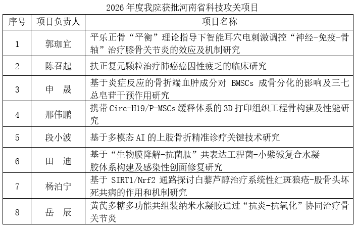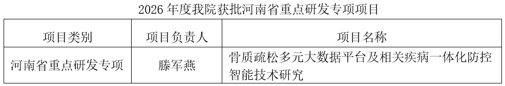 在本年度立项中,医院获批河南省重点研发专项1项。据悉,河南省重点研发专项是河南省为贯彻落实国家重大战略部署、推动科技创新与产业创新深度融合而设立的重要科技计划,鼓励骨干企业、高等院校、科研院所等联合申报、协同攻关,单个项目申请财政支持资金一般不低于100万元。医院此次斩获该类型项目,将在骨质疏松防治领域推动我省的科技创新,为区域社会发展注入新动能。