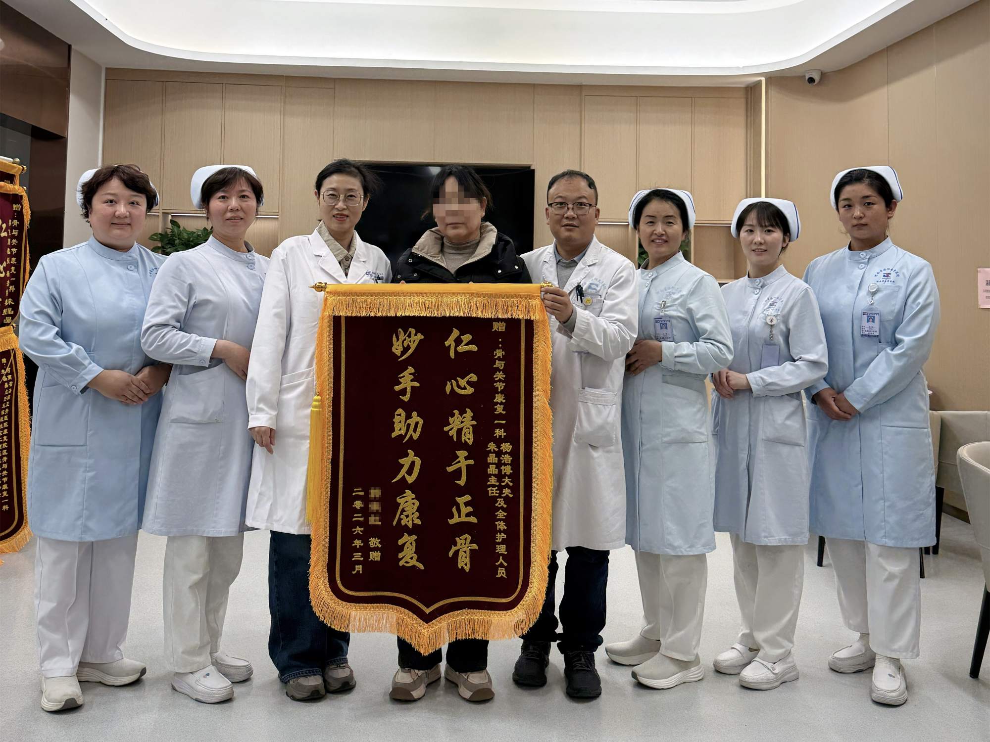 近日,我院康复院区骨与关节康复一科上演了温馨一幕。患者郭女士(化名)将一面印有“仁心精于正骨 妙手助力康复”的锦旗送到医护人员手中,以此表达对科室全体医护人员的深深感激之情。