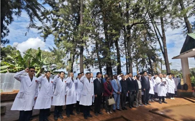 面向烈士墓碑,赵村辉和第26批援埃塞俄比亚中国医疗队全体队员郑重举起右手,重温了援外医疗誓词:“我志愿加入中国援外医疗队,牢记祖国重托,不辱神圣使命。大力弘扬不畏艰苦、甘于奉献、救死扶伤、大爱无疆的中国医疗队精神。恪守医德,精进医术,以仁心仁术造福当地人民,以实际行动讲好中国故事,为增进中外人民友谊、推动构建人类卫生健康共同体贡献全部力量!” 随后,队员们逐一上前,轻轻敬献鲜花,整理花束,以最朴素而真挚的方式寄托哀思与敬仰。