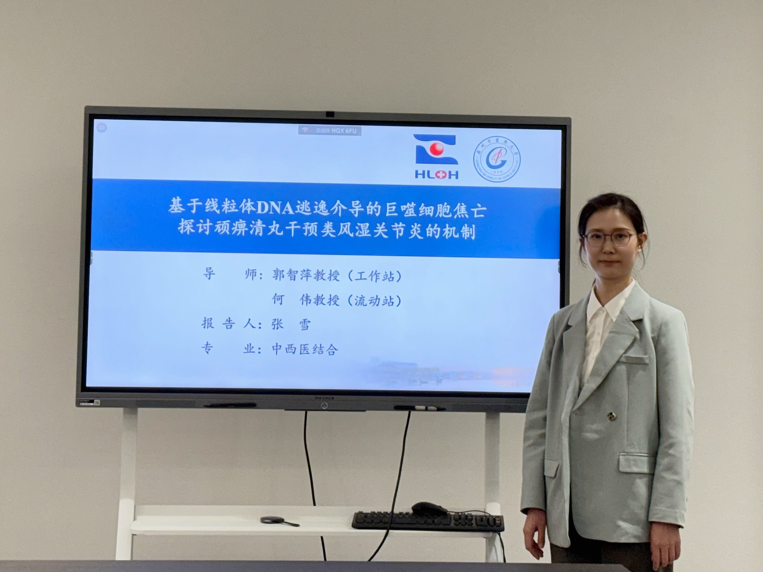 张雪博士后以《基于线粒体DNA逃逸介导的巨噬细胞焦亡探讨顽痹清丸干预类风湿关节炎的机制》为题,介绍了在站期间开展的博士后研究。该研究阐述了顽痹清丸通过调控巨噬细胞线粒体DNA逃逸及NLRP3/caspase-1/GSDMD信号通路抑制细胞焦亡,从而减轻关节炎症,为中医药治疗RA提供新的科学依据。同时张雪博士后也展示了在站期间相应的科研业绩。