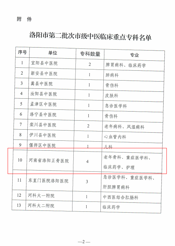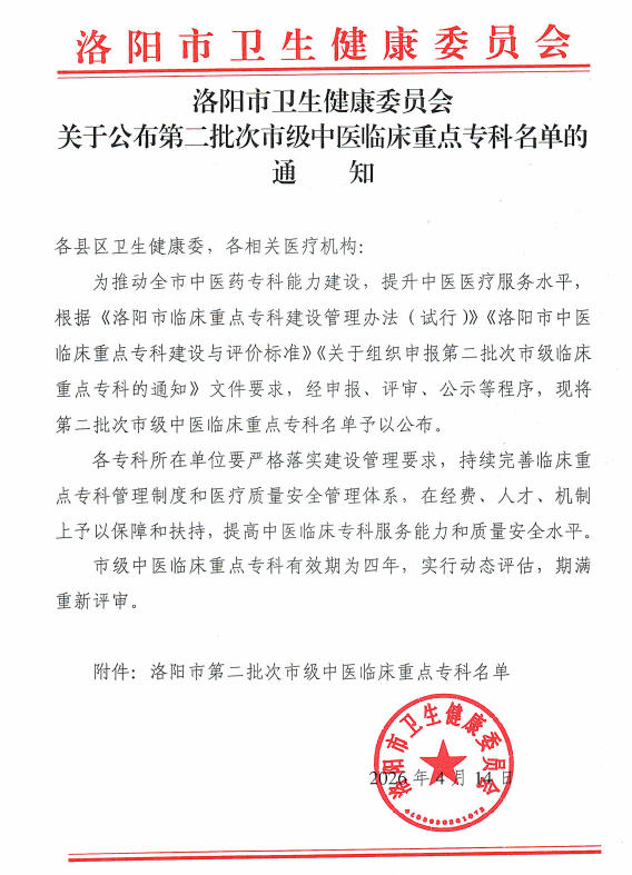 近日,洛阳市卫生健康委员会正式公布洛阳市第二批市级中医临床重点专科名单。经申报、评审、公示等严格程序,我院老年骨科、重症医学科、临床药学、护理学4个专科成功入选。此次获批,是洛阳市卫健委对我院专科诊疗能力、医疗质量安全、人才队伍建设及中医药特色优势的充分认可。