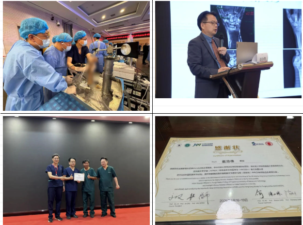 2026年国际腕关节论坛、操作坊暨第四届京港鄂腕关节镜学习班于4月16-19日在湖北省黄石市如期举办,此次会议由北京积水潭医院、华中科技大学同济医学院附属协和医院、湖北理工学院附属黄石爱康医院主办。我院郑州院区手外显微骨科诊疗中心副主任赵治伟连续三年受邀参会,并作为学员导师出席会议,与欧洲腕关节镜学会主席Mireia Esplugas教授(西班牙)、欧洲腕关节镜学会秘书长Andrea Atzei教授(意大利)、日本大阪环球骨科医院 Keiji Fujio教授,新加坡中央医院 Li Fang教授,香港中文大学威尔斯亲王医院何百昌教授、北京积水潭医院陈山林教授、刘波教授、朱瑾教授,华中科技大学同济医学院附属协和医院陈振兵教授等国内外著名手外科专家一道为来自全国各地的学员授课、传授腕关节镜操作方法。