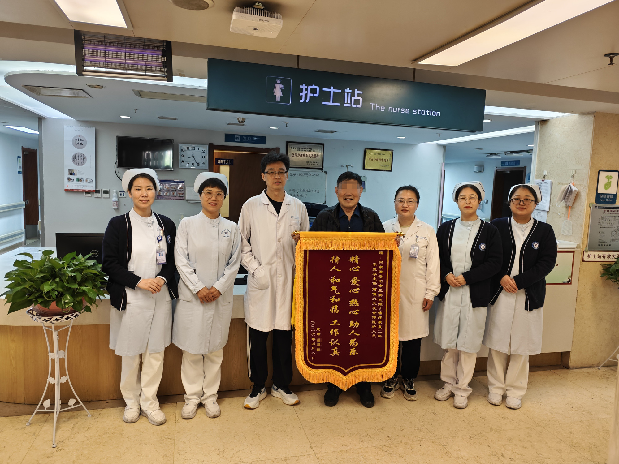 4月8日,我院康复院区疼痛康复二科护士站前暖意融融。83岁的杨先生(化名)与家属一同,将一面绣有“精心、爱心、热心、助人为乐;待人和气、和蔼、工作认真”的锦旗,送到了科室医护人员手中,以此表达对团队的诚挚谢意,也定格下医患间的温情瞬间。