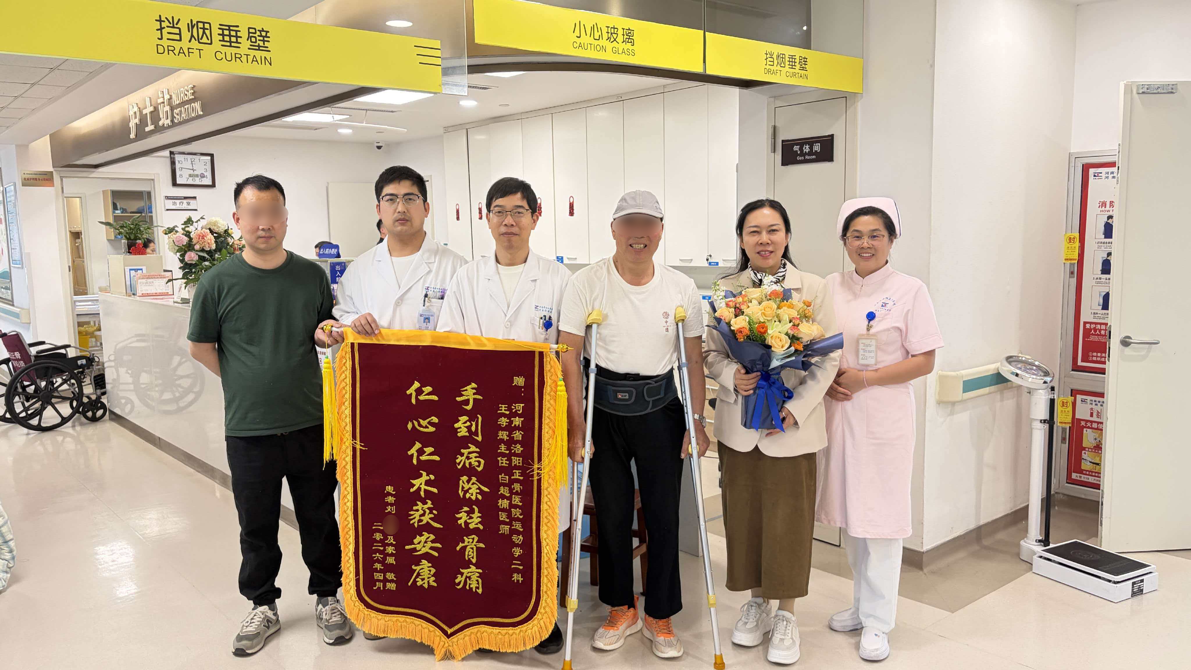 近日,69岁的患者在家人陪同下,将一面绣着“手到病除祛骨痛,仁心仁术获安康”的锦旗,赠予我院郑州院区运动医学二科主任王孝辉、医师白超楠及科室医护团队,用最质朴的方式,表达着重获健康的喜悦与感激。