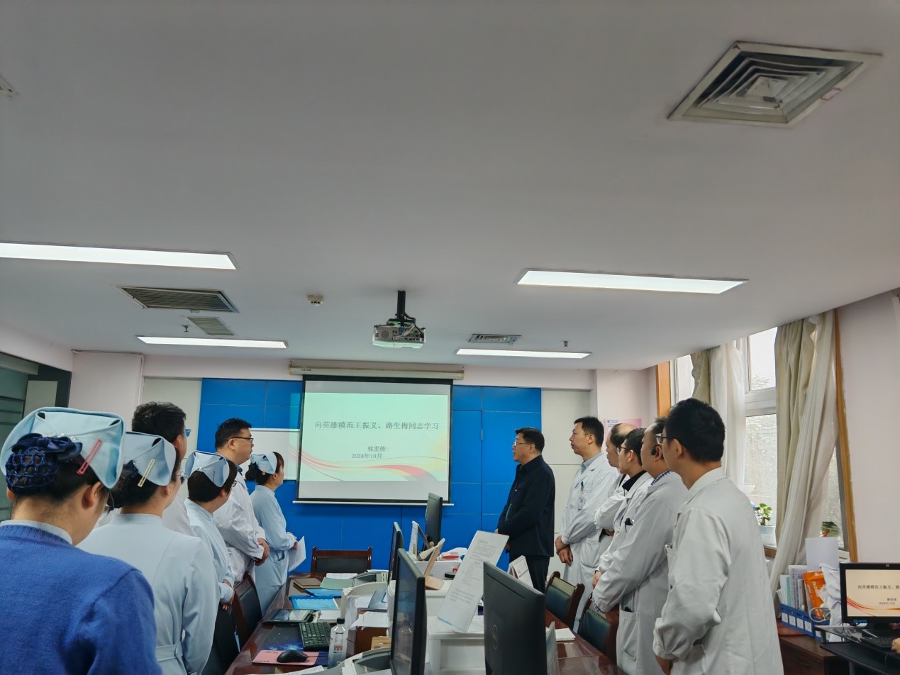 2024年10月29日上午,临床第二党总支第三党支部在二号楼四楼医生办公室开展十月份主题党日活动,会议以“向英雄模范王振义、路生梅同志学习”为主题,深入学习英雄模范的先进事迹和崇高精神。会议由党支部副书记郭晓辉主持。