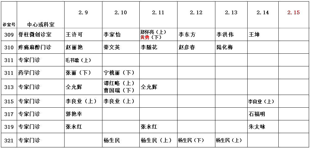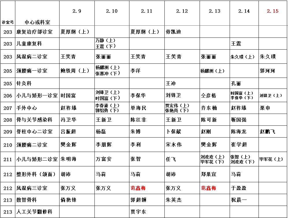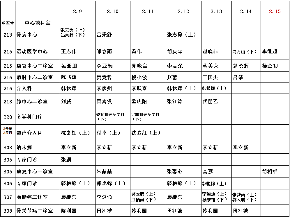 | 2026年2月1日-2月16日门诊坐诊医师排班表 | | 诊室 | 科室 | 日期 | 2月1日(周日) | 2月2日(周一) | 2月3日(周二) | 2月4日(周三) | 2月5日(周四) | 2月6日(周五) | 2月7日(周六) | 2月8日(周日) | 2月9日(周一) | 2月10日(周二) | 2月11日(周三) | 2月12日(周四) | 2月13日(周五) | 2月14日(周六) | 2月15日(周日) | 2月16日(周一) | | 一楼诊室1 | 髋关节外一科 | / | 丁强 | 莫湘涛 | 邢庆胜 | 邢庆胜 | 邢庆胜 | 莫湘涛 | / | 丁强 | 莫湘涛 | 邢庆胜 | 邢庆胜 | 邢庆胜 | 莫湘涛 | / | / | | 一楼诊室2 | 髋关节外二科 | 毕红宾 | 梁大伟 | 杜贵强 | 毕红宾 | 毕红宾 | 杜贵强 | / | 毕红宾 | 梁大伟 | 杜贵强 | 毕红宾 | 毕红宾 | 杜贵强 | / | / | / | | 一楼诊室3 | 膝关节外一科 | 张长见 | 尚延春 | 高万旭 | 张长见 | 柴巍巍 | 柴巍巍 | 刘云龙 | 郭锐 | 尚延春 | 高万旭 | 张长见 | 柴巍巍 | 张长见 | 柴巍巍 | 张长见 | 尚延春 | | 一楼诊室5 | 膝关节外二科 | 王明君 | 高文香 | 王明君 | 王鸿雁 | 肖永杰 | 何万勋 | 肖永杰 | 李鹏 | 高文香 | 王明君 | 王鸿雁 | 肖永杰 | 王明君 | 王鸿雁 | 肖永杰 | 高文香 | | 一楼诊室6 | 膝关节外三科 | 上午 | 蔡一强 | 申晟 | 袁仪伦 | 蔡一强 | 夏祖辉 | 赵涵正 | 夏祖辉 | 袁仪伦 | 申晟 | 袁仪伦 | 蔡一强 | 夏祖辉 | 赵涵正 | 蔡一强 | 夏祖辉 | 申晟 | | 下午 | 蔡一强 | 辛若冰 | | 一楼诊室7 | 人工关节翻修一科/二科 骨盆髋臼外科/外科 (整形外科/颌面骨科) | 刘文静 | 易先达 | 刘沛 | 苗万坡 | 陈晓波 | 邓俊森 | 段亚威 | 包伟东 | 易先达 | 刘沛 | 苗万坡 | 陈晓波 | 邓俊森 | 王旭 | 李建垒 | 易先达 | | 一楼诊室8 | 骨关节病一科/二科 | 上午 | 李峰 | 郭马珑 | 李峰 | 郭珈宜 | 郭马珑 | 郝军 | 郝军 | 王江一 | 郭马珑 | 李峰 | 郭珈宜 | 马梦洋 | 郝军 | 郝军 | 杨超凡 | / | | 下午 | 杨超凡 | 杨超凡 | | 一楼诊室9 | 足踝外一科/三科 | 张景伟 | 刘新江 | 杜志军 | 明晓锋 | 李晓峰 | 张景伟 | 尹利军 | 林永耀 | 刘新江 | 杜志军 | 明晓锋 | 李晓峰 | 张景伟 | / | / | / | | 一楼诊室10 | 足踝外二科/三科 | 赵建磊 | 李朝晖 | 明晓锋 | 刘骏逸 | 刘晓东 | 霍纪宝 | 郭子平 | 赵建磊 | 李朝晖 | 明晓锋 | 刘骏逸 | 刘晓东 | 霍纪宝 | 郭子平 | / | 李朝晖 | | 一楼诊室11 | 手法正骨(微创正骨)科 骨生长发育门诊 | 上午 | / | 杨亚丽 | 冯平 | 赵朝锋 | 赵朝锋 | 苏晓川 | / | / | 杨亚丽 | 冯平 | 赵朝锋 | 赵朝锋 | 苏晓川 | 苏晓川 | / | / | | 下午 | 赵朝锋 | 苏晓川 | 田振江 | 张希 | 赵朝锋 | 苏晓川 | 田振江 | 张希 | 3015室 | | 二楼诊室1 | 脊柱中心一诊室 | 李磊 | 孔凡国 | 耿捷 | 姚杰 | 张昌盛 | 张文明 | 林松 | 李磊 | 孔凡国 | 耿捷 | 姚杰 | 张昌盛 | 张文明 | 林松 | 李磊 | 孔凡国 | | 二楼诊室2 | 脊柱中心二诊室 | 朱文潇 | 马虎升 | 孙彦鹏 | 牛辉 | 吴强 | 刘玉峰 | 王衡 | 朱文潇 | 马虎升 | 孙彦鹏 | 牛辉 | 吴强 | 刘玉峰 | 王衡 | 朱文潇 | 马虎升 | | 二楼诊室3 | 脊柱中心三诊室 | 上午 | 郭明伟 | 崔宏勋 | 周献伟 | 刘世敬 | 耿端 | 陈洪柱 | 程卫东 | 郭明伟 | 崔宏勋 | 周献伟 | 刘世敬 | 耿端 | 陈洪柱 | 程卫东 | 郭明伟 | 崔宏勋 | | 下午 | 郑振雨 | 郑振雨 | | 二楼诊室5 | 骨坏死一科/二科 | 上午 | 任之强 | 孙楠 | 阎晓霞 | 赵利敬 | 孙楠 | 阎晓霞 | 任之强 | 任之强 | 孙楠 | 阎晓霞 | 赵利敬 | 孙楠 | 阎晓霞 | 王震 | / | / | | 下午 | 任之强 | 冯方 | 任之强 | 冯方 | | 二楼诊室6 | 脊柱中心六诊室 | 上午 | / | 张海波 | 李俊辉 | 苗吉显 | 安永博 | 李俊青 | 姚杰 | 刘玉峰 | 张海波 | 李俊辉 | 苗吉显 | 安永博 | 李俊青 | 吴晓阳 | / | / | | 下午 | 王勇飞 | 逯自强 | 王勇飞 | 逯自强 | | 诊室 | 科室 | 日期 | 2月1日(周日) | 2月2日(周一) | 2月3日(周二) | 2月4日(周三) | 2月5日(周四) | 2月6日(周五) | 2月7日(周六) | 2月8日(周日) | 2月9日(周一) | 2月10日(周二) | 2月11日(周三) | 2月12日(周四) | 2月13日(周五) | 2月14日(周六) | 2月15日(周日) | 2月16日(周一) | | 二楼诊室7 | 运动医学一科/二科 | 上午 | 魏立伟 | 王孝辉 | 黄遂柱 | 魏立伟 | 黄遂柱 | 王孝辉 | 张春琪 | 宋卓悦 | 王孝辉 | 黄遂柱 | 魏立伟 | 黄遂柱 | 王孝辉 | 张春琪 | / | / | | 下午 | 黄广振 | 黄广振 | 黄广振 | 黄广振 | | 二楼诊室8 | 重症医学科/内科 足踝外二/三科 | / | / | / | 徐道志 | 马晨 | / | 王社言 | / | / | / | 徐道志 | 乔杨 | / | 王振 | / | / | | 二楼诊室15 | 小儿骨伤科与矫形科 | 上午 | / | 丁幸坡 | 陈登山 | 卢博 | 张传维 | 丁幸坡 | / | / | 丁幸坡 | 陈登山 | 卢博 | 张传维 | 丁幸坡 | / | / | / | | 下午 | 王磊 | 于晓超 | 王磊 | 于晓超 | | 二楼诊室16 | 人工关节翻修一科/二科 | 刘爱斌 | 李帅垒 | 刘金磊 | 刘亚峰 | 翟沛 | 杨晨曦 | 张伟 | 张亚奇 | 李帅垒 | 潘建康 | 刘亚峰 | 翟沛 | 理阳 | 刘明强 | 杨泊宁 | 李帅垒 | | 二楼诊室17 | 手外显微骨一科/二科 | 王晨亮 | 赵治伟 | 查朱青 | 周明武 | 牛洪华 | 赵治伟 | 王向阳 | 崔博 | 赵治伟 | 查朱青 | 周明武 | 牛洪华 | 崔博 | 李付礼 | / | / | | 二楼诊室18 | 手外显微骨科 药学门诊/介入科(血管外科) | 上午 | / | 谢伊源 | 温阳阳 | 李瑞奇 | 李彦丰 | 孔凡国 | 周明武 | / | 谢伊源 | 温阳阳 | 李瑞奇 | 李彦丰 | 孔凡国 | 温阳阳 | / | 谢伊源 | | 下午 | 刘耀华 | 刘耀华 | | 二楼诊室19 | 肩肘外一科 | 陈曦 | 周中华 | 王春喜 | 杨波 | 王春喜 | 陈曦 | 张阳 | 牟攀 | 周中华 | 王春喜 | 杨